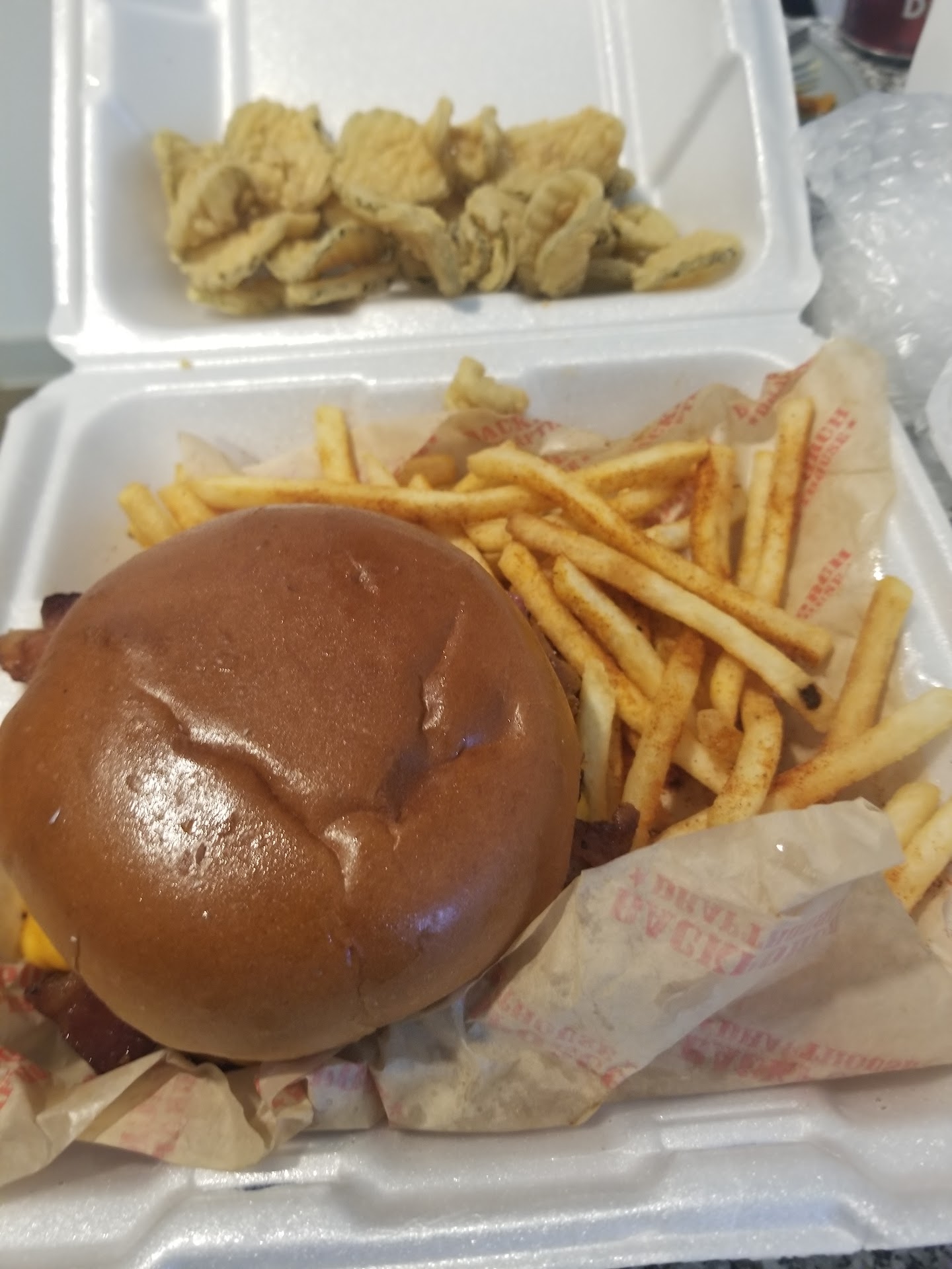 The first time we ordered from here they didn't give us fries for either of our burgers. I didn't check the food before I left so I had to double back. While I was waiting for them to re-fire my order, I was harassed by an intoxicated patron who was so drunk that he couldn't keep his shoes on. A member of staff moved me closer to the kitchen to wait to be away from him, and told me he had been cut off. I got my food all bagged up with a brownie sundae as an apology, and I thought I wouldn't need to double check the food before I left. I wish I had, because we paid extra for both fries to be seasoned, and they were plain. One of the fries was also supposed to be well done, but they were the same. The burgers were really great, but our apology brownie was burnt.