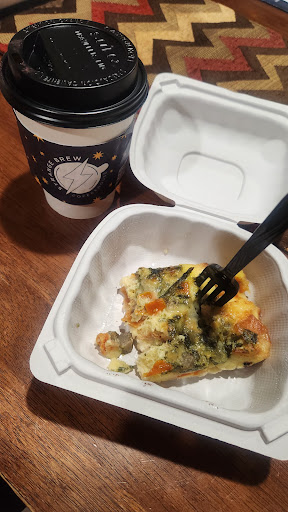 Read more1st time going there and they were very friendly. Gave me time to look at menu and decide what to get. I went with spinach and artichoke quiche and it is sooooo delicious. Taste homemade with all the wonderful flavors blended and cheesy. I hesitate to get quiche because people can mess it up bad...not here. This was good. I had to get it because they didn't have salads, which I was disappointed but this yummy quiche made up for it. The Golden chai is also very good. I will be going to back to try the slew of coffee options they have. Come and support our new coffee place in town. Prices were reasonable too.
