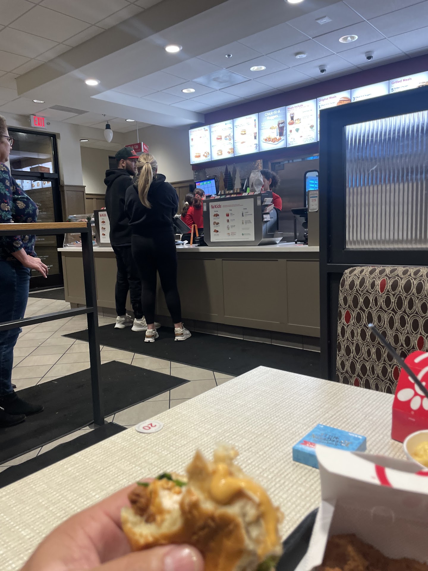 Read moreThis was our 2nd visit to this location. I waited 15 mins to place my order of 4 meals. (3 chicken sandwiches and 1 wrap).I got to front of line to park at pick up cone about 10 mins later. After watching 11 cars go around me in line, I got attn of a worker & asked that he please check on status of my order.