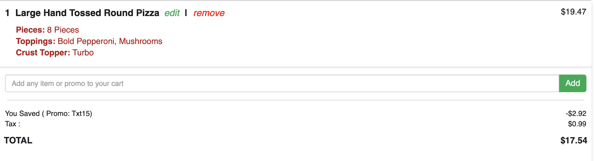 When I do my usual text to order a two topping pizza is $17.54. If I do the same order with a current coupon from the circular they gave me, the price increases to $18. So I would be paying a $.49 premium for using a coupon over just using text to order.