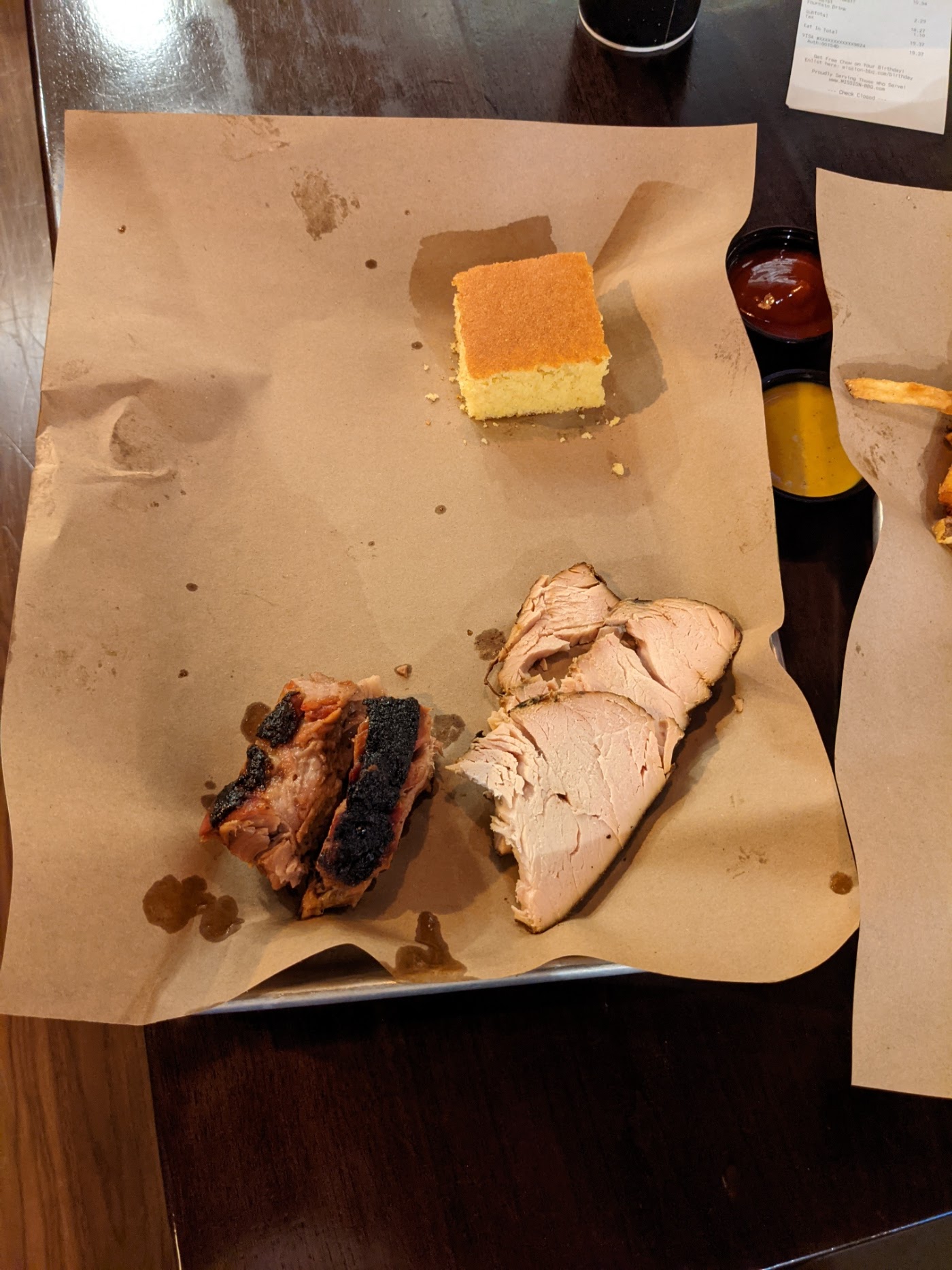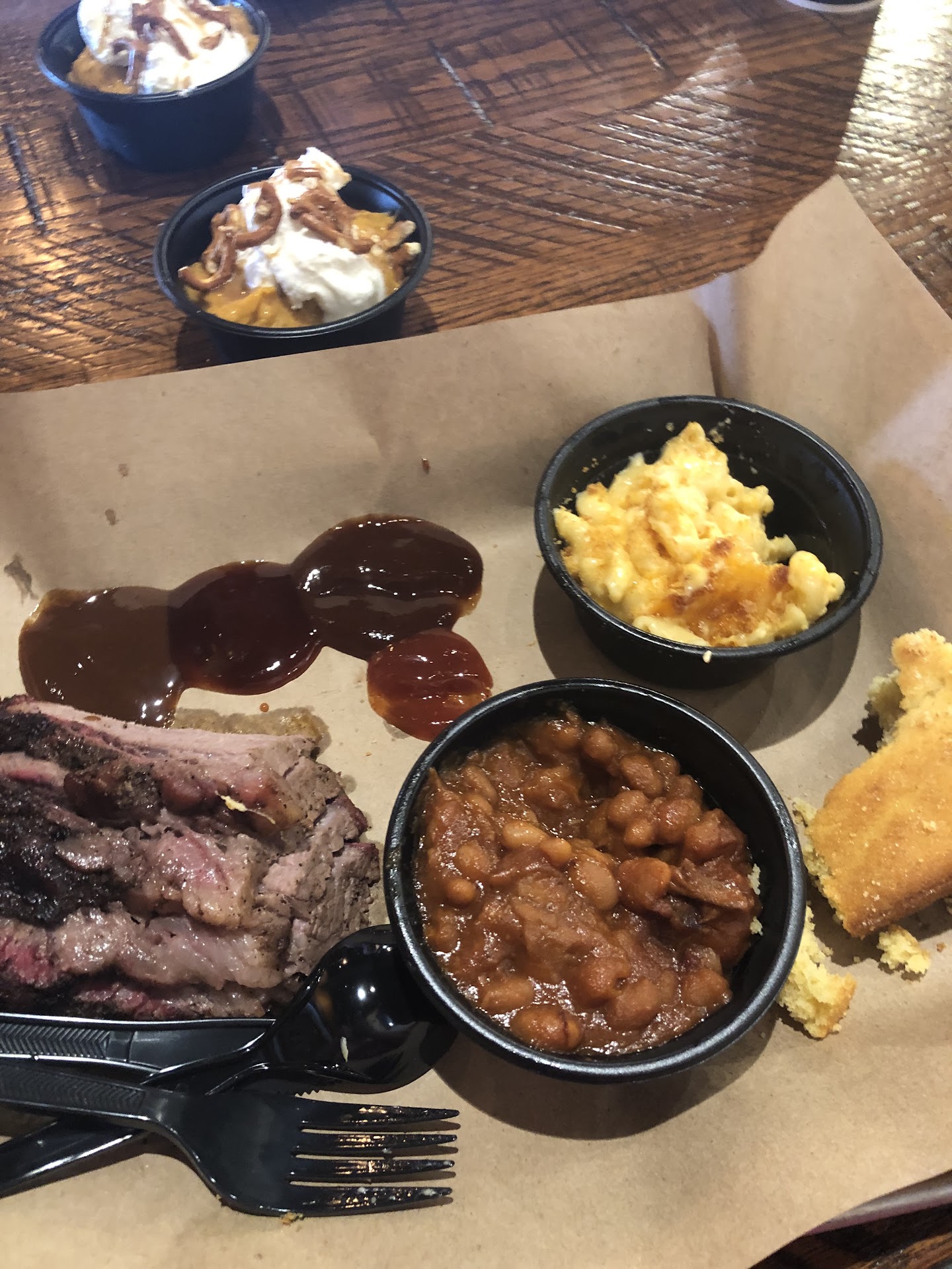 Food is delicious- We ordered a brisket combo with Mac cheese and baked beans- and a pulled pork w/ mac - meals came with cornbread
