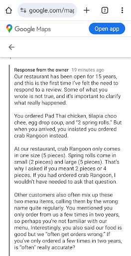 Added images of her response...Look, she is still arguing with me. She is still lying. Still blaming me. I ordered crab ragoons. Repeated myself several times. When I arrived I pointed out the order was wrong she went off on me blaming me. And is STILL blaming me on this review response. She could have said "Sorry we messed up. Let us fix it." Her response proves my point vividly.