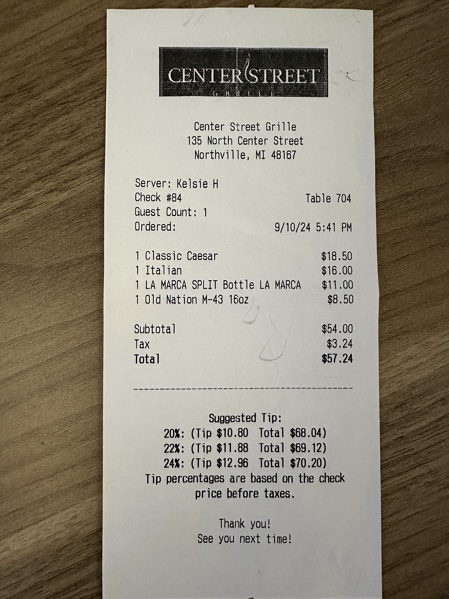 Read moreNormally I would score Center Street Grill 5 stars as the food is great and so is the service. Consequently this place is clearly on our list of "go to" restaurants. However, today's visit fell short when both my wife and I ordered salads. My wife requested that the dressing for her salad be on the side whereas I said that mine could be just all mixed up which is what we usually request when ordering salads. When I received the bill I noticed a small charge for "tossing" my tossed salad even though this was not pointed out during the ordering process (probably understandably embarrassed to explain a "tossing" charge for a tossed salad). When I mentioned this to our service provider I received a rather edgy reply that it would be removed from the bill this time but that I need to keep this in mind for the future when ordering salads. Nickel-and-diming like this is a little beneath an establishment like Center Street Grill as is the "traffic cop" like warning that "it better not happen again" which I received.