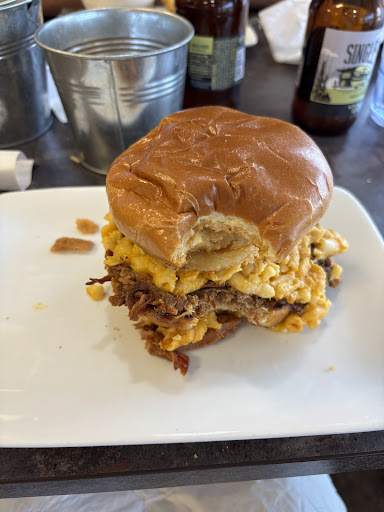 We arrived at 4:15 and told dinner isn’t served til 5:00 only drinks and appetizers… even though they were open at 11:00 am. Ordered jalepeno poppers(delicious) fish n chips and hog heaven sandwich. Fish came to the table cold with rotten sweet potato ( substituted) bbq sandwich had old congealed Mac n cheese…2 onion rings were delicious. Waitress never came to check on meal…After waiting over 20 minutes my husband had to walk up and bring it to their attention, asked for the check. The waitress brought the check & charged for the uneaten cold fish and rotten potato. My husband finished my bbq pulled...