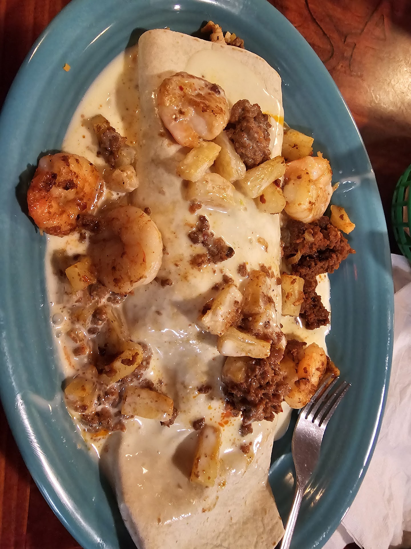 You know it is a problem when a four year old is complaining about how chewy the chips are, but hey, free is free. My burrito was almost all bean and rice inside with very little meat. The meat was wayyyyy over salted. The shrimp on my plate were the only good thing out of all our food. And really, the shrimp were PERFECT other than being cold. My entire meal was cold.