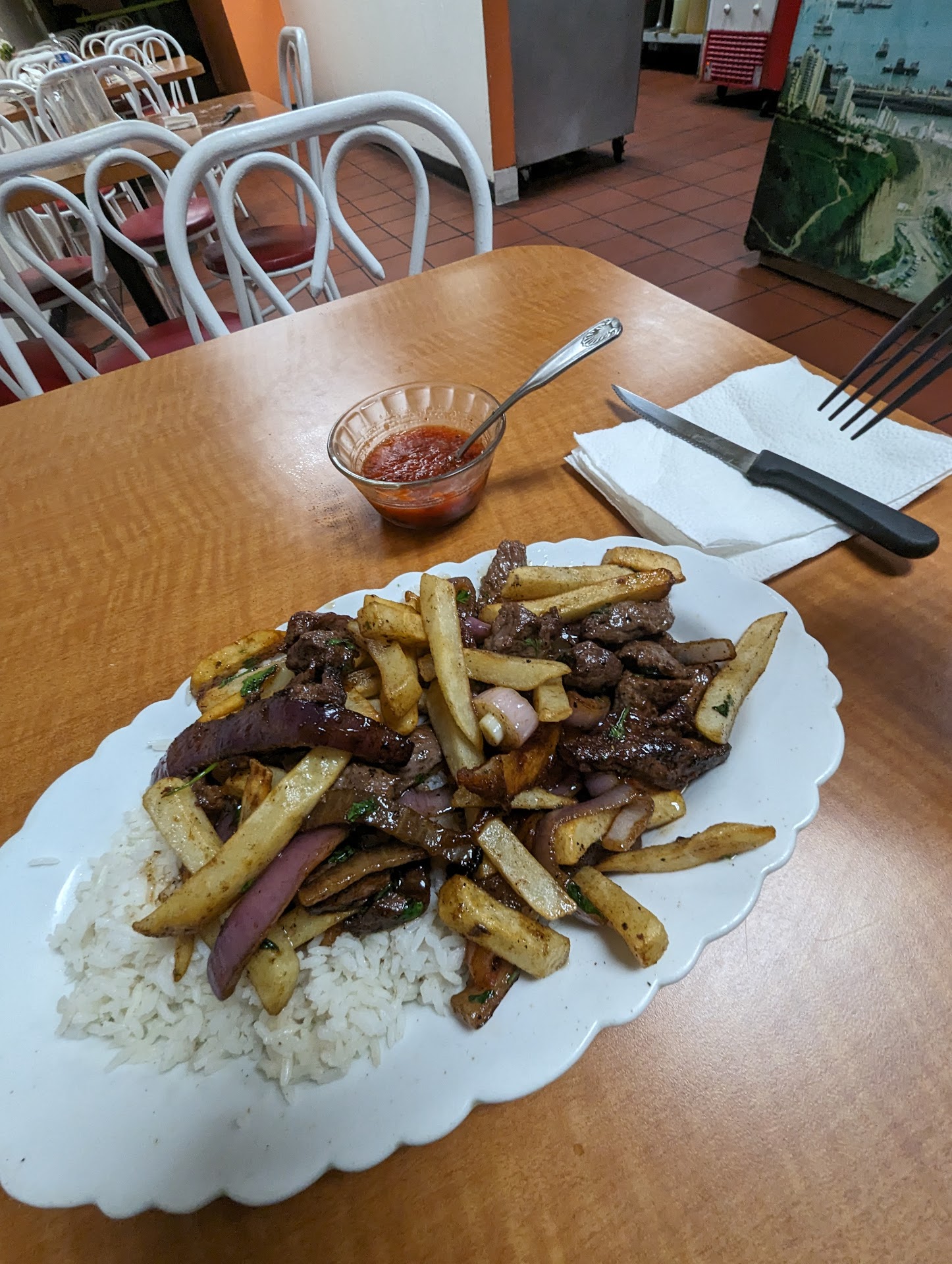 Read moreWe stopped in for dinner on a Saturday craving Peruvian food. One older Latino working the register and cooking the food. He was very nice, funny, and accommodating while taking our requests and our food orders. The food was delicious. I got the Saltado de Mariscos. They were out of papa huaracaina, and the place was a bit cold. I'm not sure if the heater was out. I'm still giving the place 5 stars because my little cousin drank the liquid from her soup, and she wanted to take the chicken and noodles home anyway. He ended up filling her take home container with broth. That was very nice and special. She was happy, and that made me happy as well. Support this nice guy and his restaurant. You won't be...