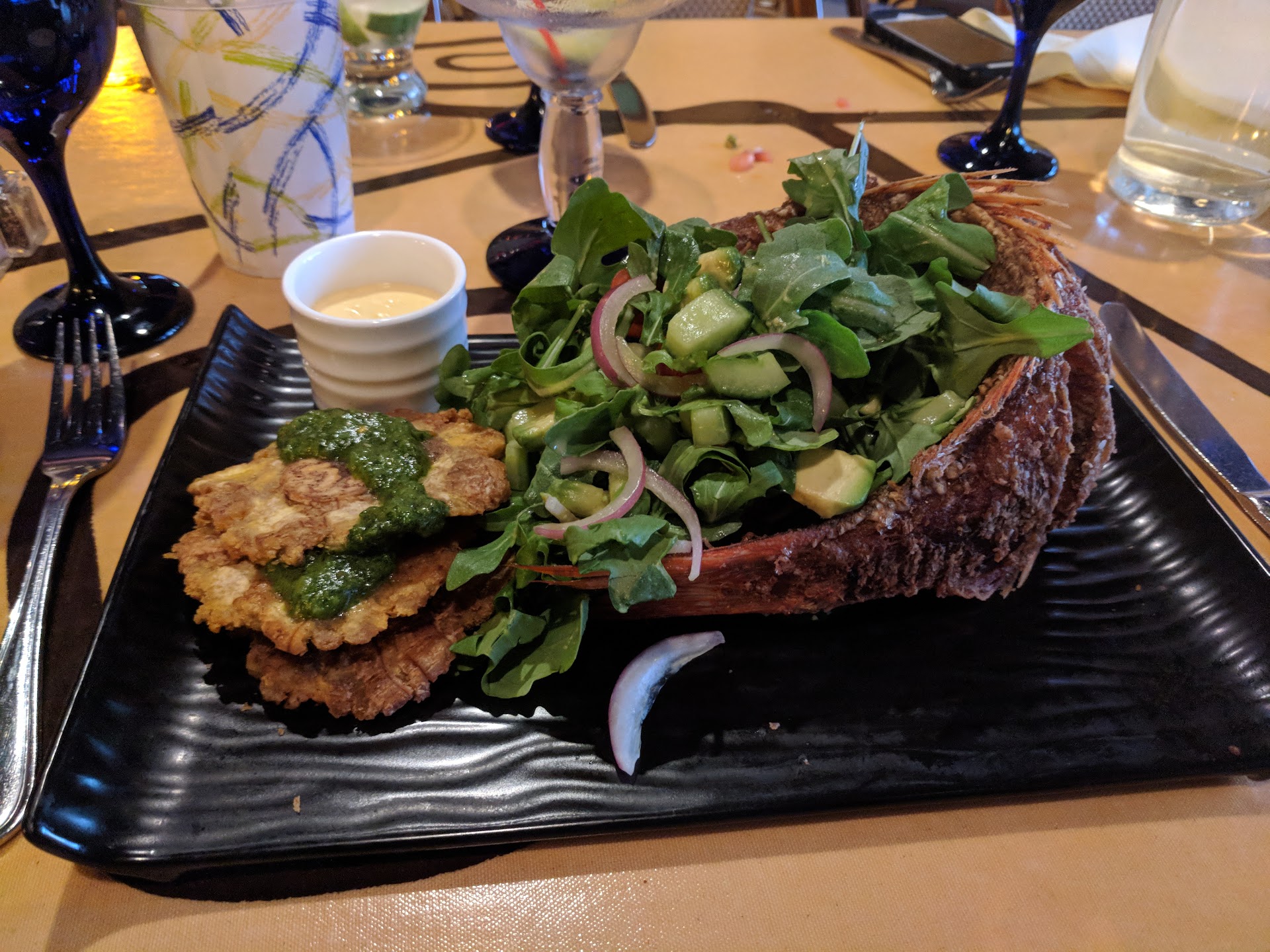 Regardless, the food is spectacular. I was pleasantly surprised by the red snapper, which was fried to an incredible extent. Skin was very crispy, some of the bones were so fried they were nice and crunchy. The fish itself was great, well seasoned (not over salted like most places you order a fried fish), and paired really well with the sauce provided. I would definitely come back here and probably eat at the bar or something to get drinks and food a...