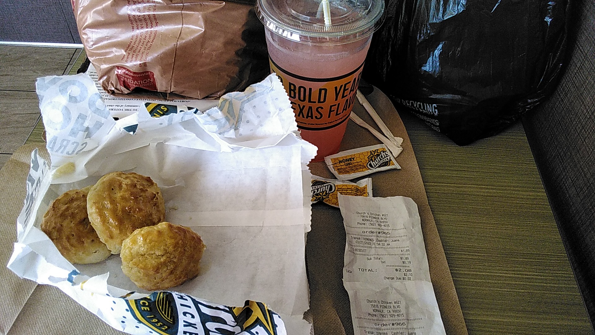 Read moreI didn't have too bad of an experience from this spot but the restaurant was a tad bit unclean and they didn't have a bathroom for customers. I Wall d in normally and the guy at the register was alert. He didn't greet me but he was alert. I asked to purchase one biscuit, he suggested the 3 promotion. So I got three. I then decided to get a drink A strawberry Blast, he didn't ask me what size I wanted but pulled out a large cup so I guess there was only one size. He gave me honey for my biscuits and a straw. I then proceeded to a table in the back of the extremely small restaurant and to my surprise the tables were dirty all of them. So I kindly reapproached the register and asked the employee to clean the table or if he could get someone else to. He proceeded without hesitation but with some hesitation and cleaned the table. Then there was a man I don't even know where he came from. He just started ordering the guy to clean more tables but he only did one of the 4 other tables outside of the one I was going to be having my Meal. The employee returned to his register and the man started asking the employee if he was ordering food and if he paid for the food he ordered. The employee made a mumbled response but I could not hear. They don't offer dine in WiFi or any customer service tools. But good biscuits and very good lemonade, bad to see this business...