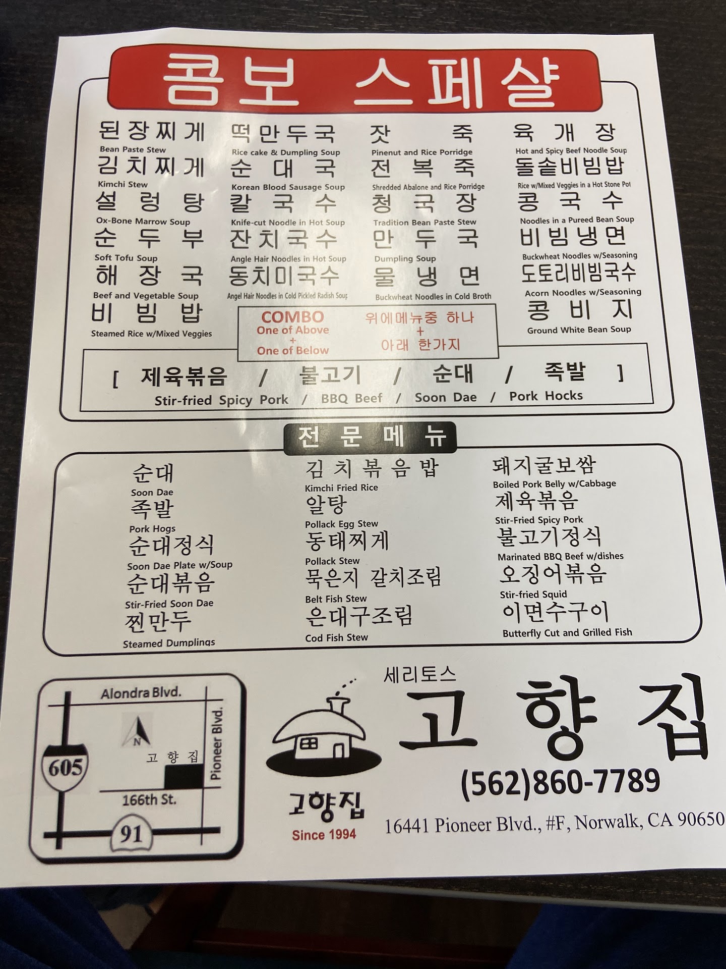 Looking for a new place to eat, I gathered intel on Go Hyang Jib, located in a Korean strip mall across one of those Korean nude spas, where your skin is scoured off like a trout being cleaned for dinner. I deduced I wanted either their soondae gook or their mudfish soup. Mission directives certain, I made my way over for a lazy Saturday lunch.
