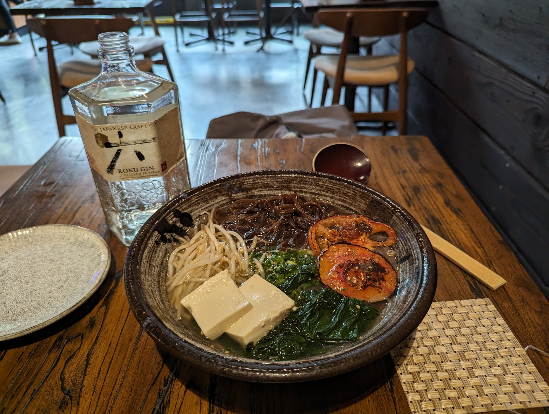 The service is excellent to excess. No fewer than three very friendly people kept asking me if I needed anything. But of course it was the food most of all that made this place stand out. My main dish was the vegan ramen, which was truly comfort food for the soul. And what a stroke of genius to include a tomato! (See photo.)