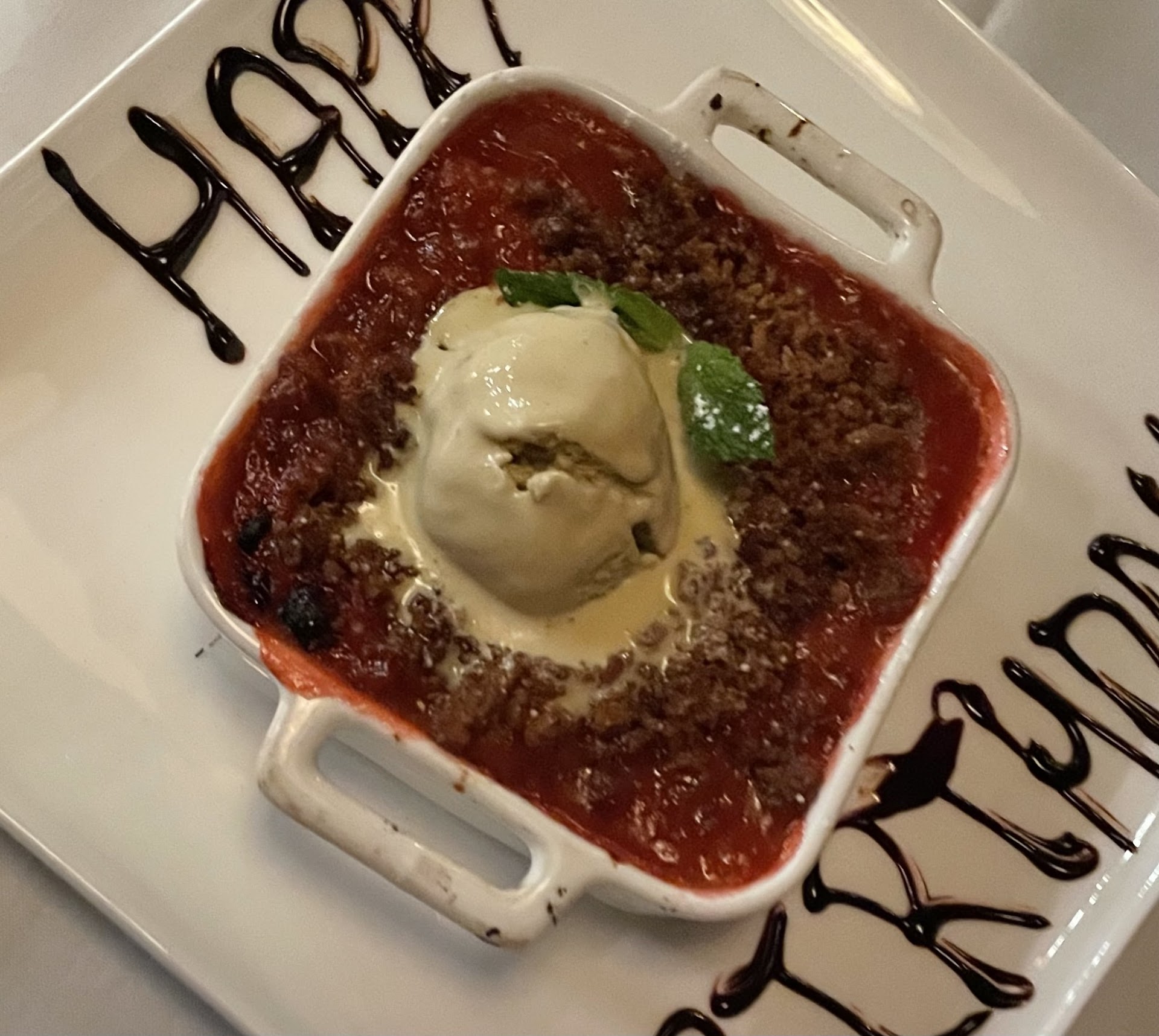 Strawberry rhubarb crisp - Warm fruit topped with an oat crumble, served with pistachio gelato. Delicious way to end the...