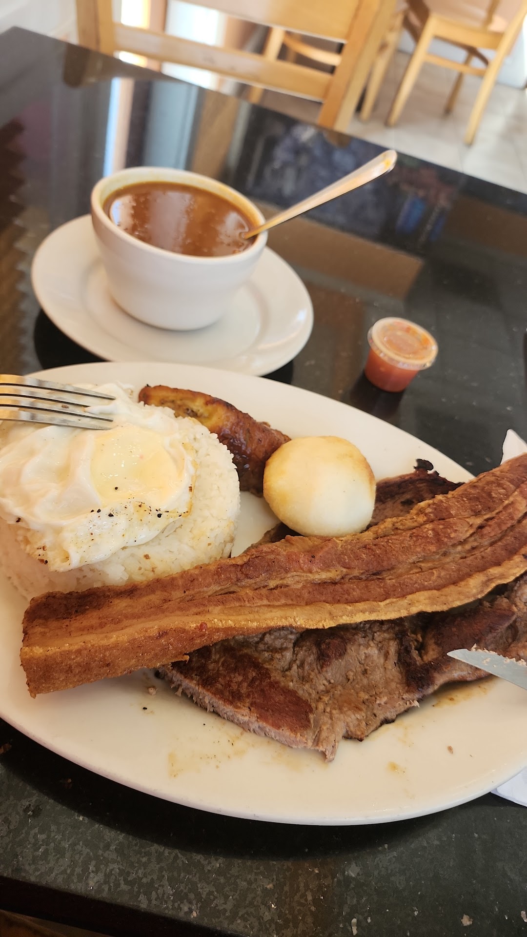 Read moreMy girlfriend and I had plantain soup, my first time lol, it was great! We had chicken breast with a very good seasoning, with salad and white rice.. professionally made! A simple lunch well done.. an open-mindedness to latin cooking is helpful.. I am not latin but fully aware..lol.. I will definitely return and try some of their bakery products.. this establishment is small but comfortable so a little humility goes a...