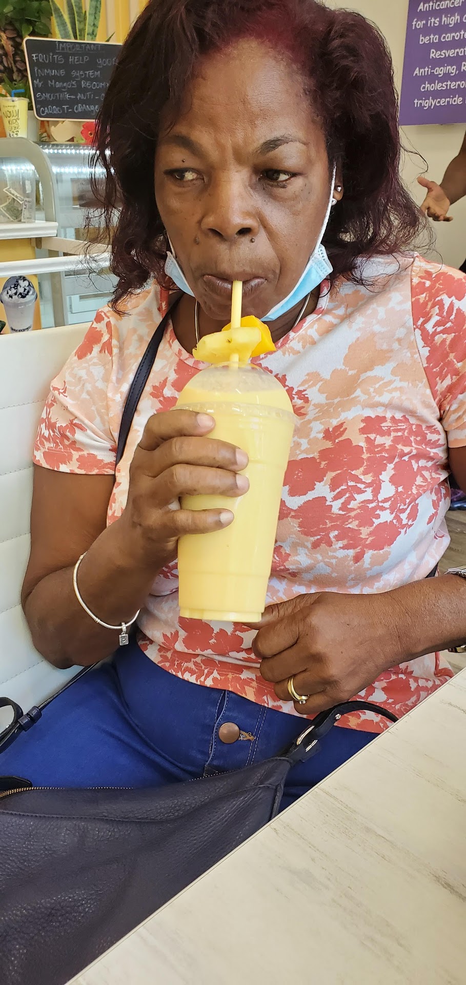 Read moreLet me tell you. If you haven't been to Mr Mangos. You missing out. I love their smoothies. Just as they promised they don't use sugar and dairy. Plus the presentation is always on point. I always get my own smoothie with pineapple,mango, and papaya with ginger. The smoothie is a meal by itself The environment is also clean. I would definitely recommend people to come here and try a smoothie. That picture is my mom with the green smoothie. She asked for it but she didn't like it because it has celery in it. I had to give her...
