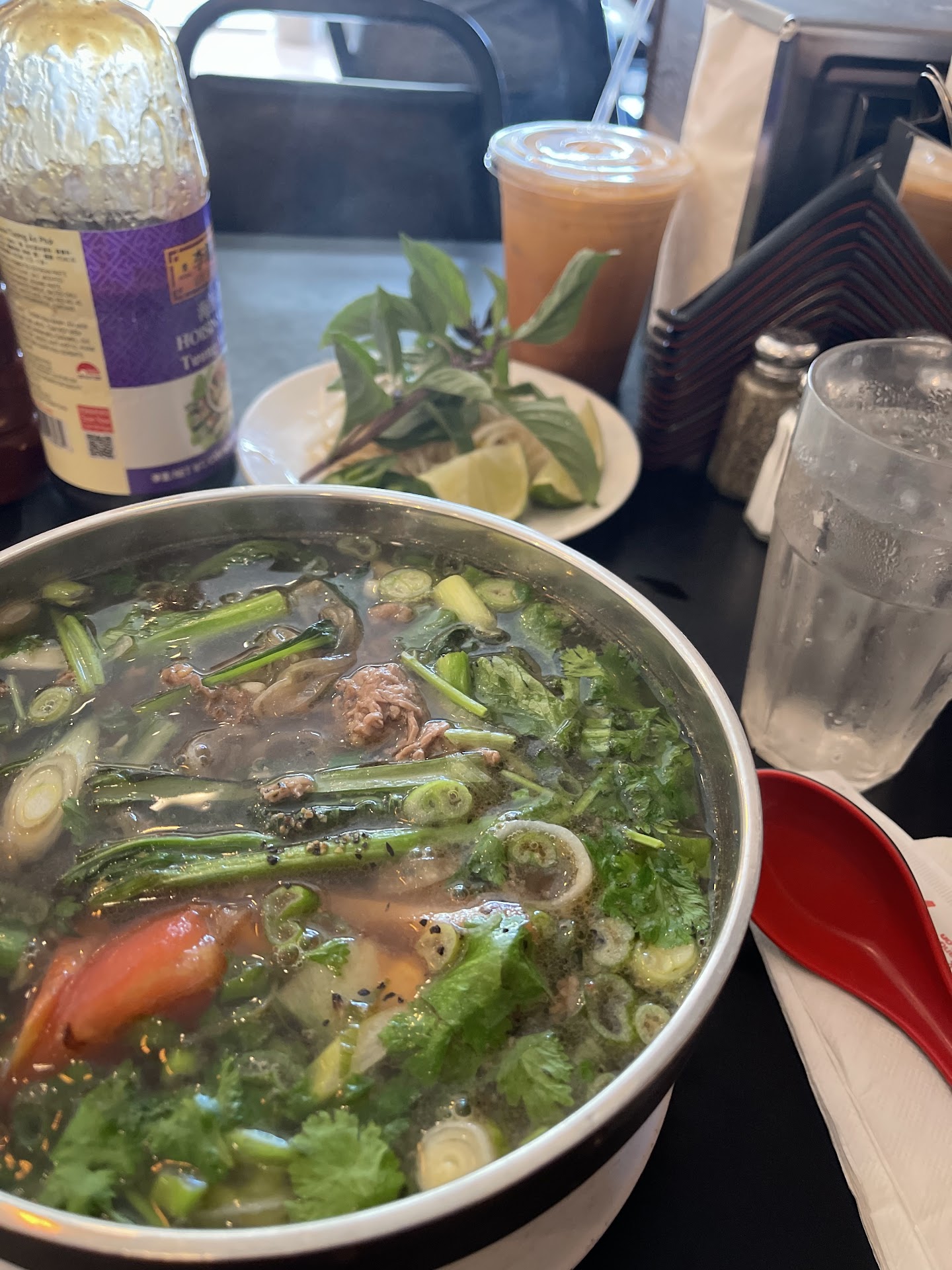 Read moreGood parking. Closer spots get taken fast. Wasn’t that packed today (Sunday) but as the time came closer to 1/1:30pm more people came in. The service was great. Waitress/host was very polite and friendly. Server was kind as well. The food was great. I just feel (everyone’s taste buds are different) it could have had more cabbage and garlic. I got the #27 I believe . Meat was tasty nice and hot. Noodles were the flat (think small fettuccine noodles) I prefer the rice pho noodle(like spaghetti). Flavor was great. Not the best but definitely not the worst! Worth a try. The Thai tea was bomb. The major disappointment for me was the MUSIC! Doesn’t go with the food at all, the weekend and a bunch of love and break up songs. Would be 10000000x better with traditional Vietnamese music! I think it’s the location and maybe the target of a younger crowd? Either way please change it asap! Thanks for some...