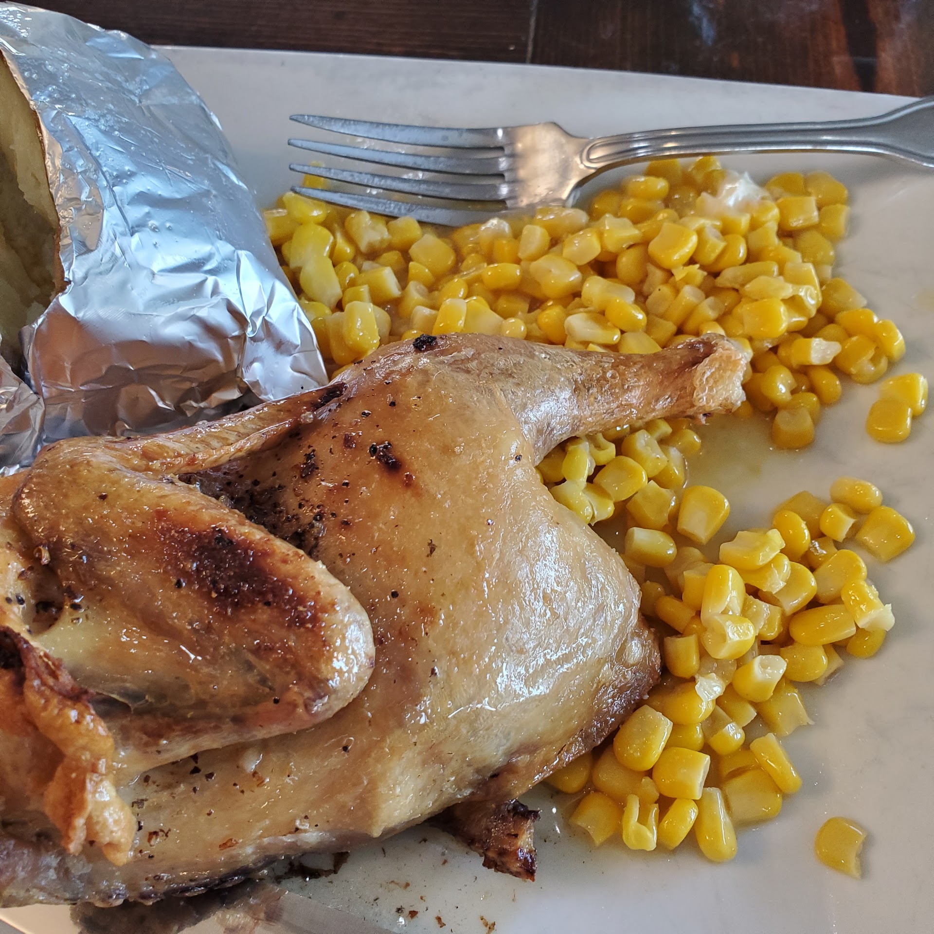 Well this was not a good visit. Bowl of Avglolemeno soup was bland - no lemon flavor and they used broken pieces of spaghetti instead of the recipe traditional orzo pasta?? Bland. Ordered 1/2 roasted chicken- omg what a mistake. It was slightly larger than the size of a cornish game hen. The leg was less than 3" long and the wing was a joke- nothing but skin and bone. Since it was so small- the breast meat was dry ( I had to stop trying to chew it and left it on my plate) and the thigh was the only section that resembled a freshly roasted, small bit of somewhat moist chicken meat. My fault- I should have sent it back. But the best entrees were about $35.95! So saving $12 turned out to be the worst decision. Plus- Baked Potatos should be offered the option of sour cream and chives- not done til I asked for some sc. This entree needs to be re- evaluated by the kitchen...