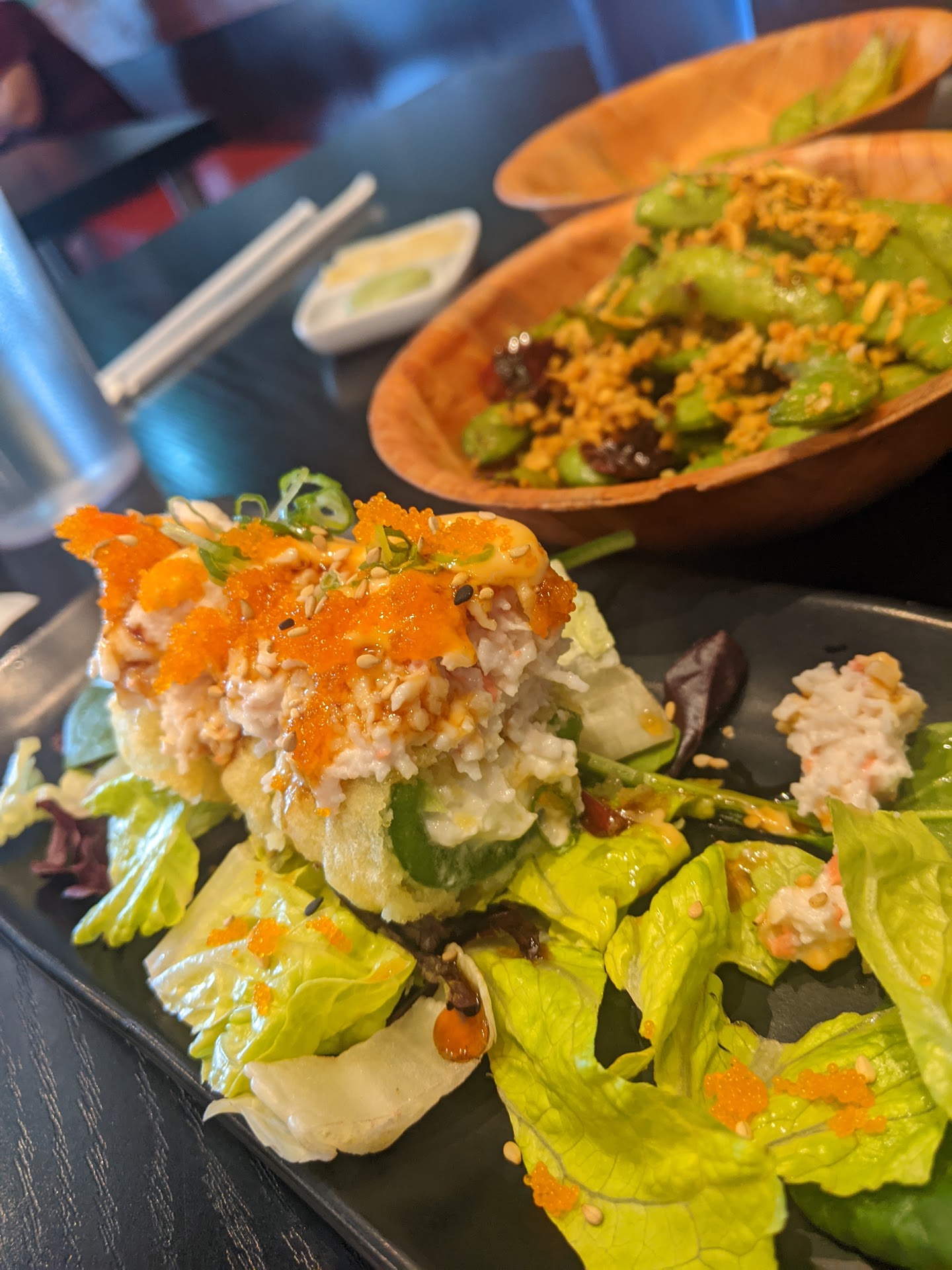 Dropped in during a long drive, and I was ravenous for sushi. Tried two rolls on the BOGO 50% off discount menu (Kung fu panda roll and something else with cooked salmon) and neither of them really tasted good enough to scratch the itch. Husband had the salmon collar which he loved but just heads up it usually takes a little while to cook so if you order it as an appetizer it will have you waiting. He got some wings in the interim that were just spicy with a little kick. Kiddo got the chicken teriyaki bowl (we had ordered the side and I think they thought it was the full order bowl so we had a lot of leftovers). Service was okay but even though it was not really busy we didn't get asked if we wanted our waters or teas refilled. It was a Monday so maybe it was not a great night to go or maybe the staff was new? Decor was fun to look at and the music was very early 2000s if you like that vibe. Might try again but probably not anything on the...