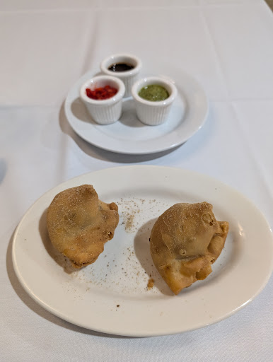 I got a Mango Lassi and we get some complementary thin (naan?) chips with a variety of sauces. We started with some dumplings (medium level spicy) that were served with peppers and onions and they were incredible. Then we got rice, butter chicken, traditional daal, and house naan which was stuffed with onions and very tasty especially with the butter chicken sauce. At the end we tried some rice pudding dessert that had a lighter flavor than it looked, but quickly filled me up.
