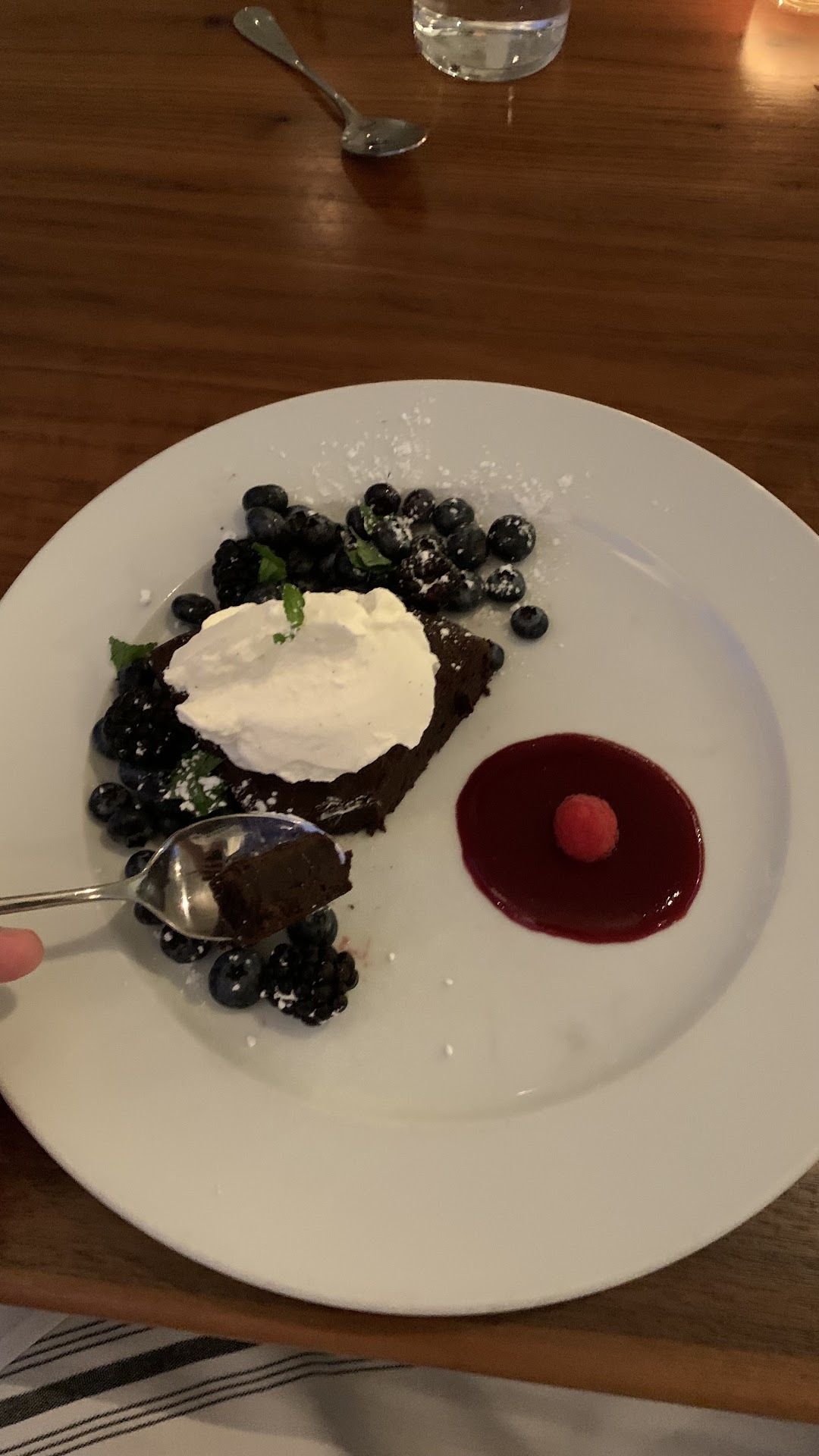 An outstanding meal in a beautiful "modern-barn" restaurant with excellent service. One of the best meals I've had in a long time. The slight char on the Spanish Octopus on a warm lentil base with a delicious dressing, or the generously sized branzino, meaty and fulfilling, with a slight salt crust and a baked onion cake with creamed spinach - sublime. Dessert's olive oil cake with enormous and tasty raspberries looked beautiful and was just as good. The sourdough bread's strong sour taste, accompanied by soft butter sprinkled with coarse salt was so satisfying.