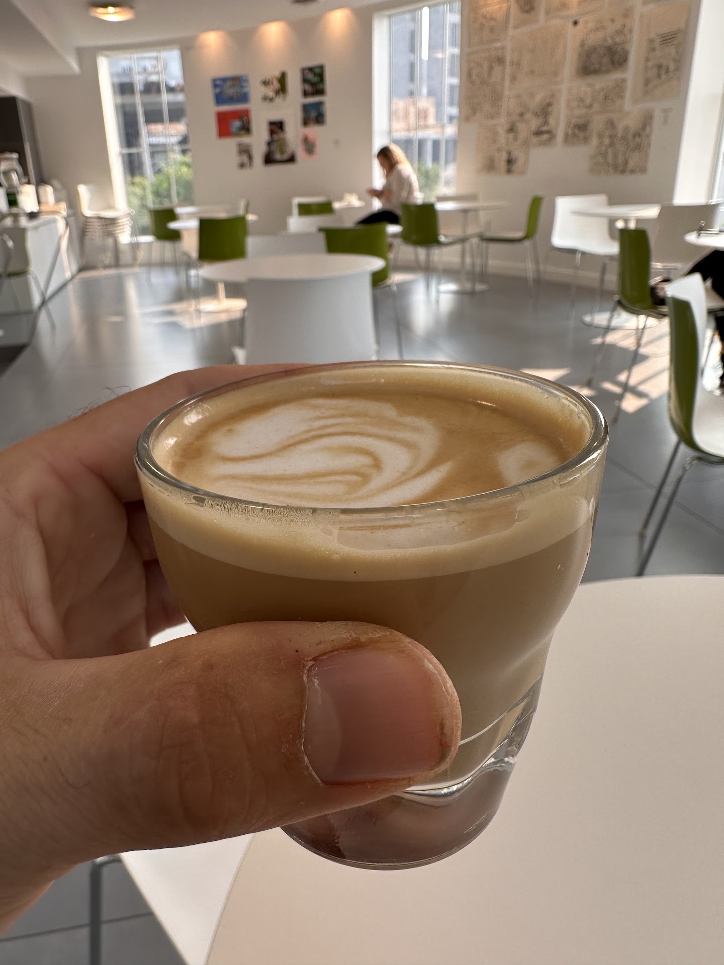 Nice, natural light room with artwalk all over the walls (appears to be from children from the area). I had an avocado toast with scrambled egg and a cortado. Both very good. Nice clean area to sit and quiet. My only input is the building appeared closed from the outside and I thought I must be in the wrong place because it looks more like a closed museum than a coffee shop. But I took a chance and tried the door and found the cafe in the rear...