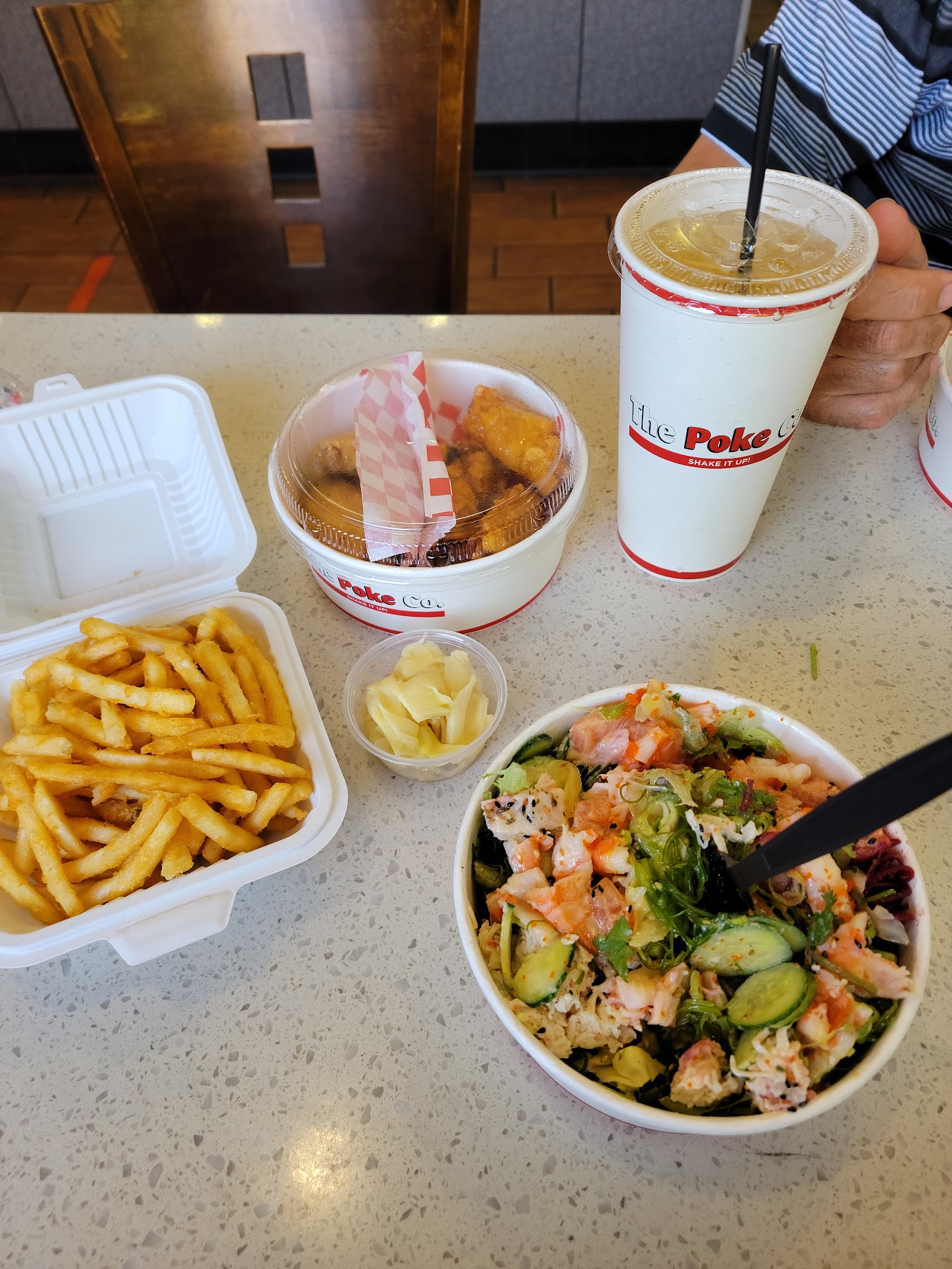 This spot NEVER lets us down. My wife and I have been coming to poke co. For over 3 years now and we are regulars. On account that my wife and I are now expecting our first baby, my wife developed gestational diabetes, my wife is still getting her "fix" lol she gets the medium salad bowl with all the veggies, 2 crab meat scoops, and 2 shrimp scoops. All which is cooked.... the pokeco furious (PLEASE DONT STOP MAKING IT), Hawaiian island, and spicy mayo. I tried the lemon pepper wings bone-in, and fell in love!! No joke, the wings are better than wing stop... if you're into the asian fusion flavor, the wings here will be a great choice. Recently I had a mango wango smoothie with boba and it really made my day. Especially since its starting to het warm these days. The customer service is great and always so welcoming. All the girls are always so kind, and the manager has always been the best. Restrooms are clean so thats a plus. During these weird uncertain times, please support local businesses. Thank you poke co. And wings.... my wife...