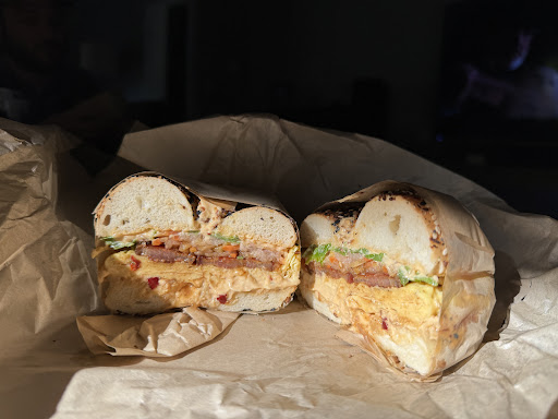 First time visiting after seeing several TikTok/social media influencers talk about this place. I ordered a standard sausage egg and cheese on a plain bagel and my boyfriend ordered the cashiers suggested choice. It was a steak and egg bagel (already very $$$) with the addition of sauces and sautĂŠed onions per the suggestion. We also ordered the seasonal bagel (tomato basil). We waited for our order and found a small two top table to dine at as we live over a half hour away and do not enjoy eating in our cars in a gas station parking lot or eating cold food after a long drive. It was cramped, chaotic, and uncomfortable to dine in. They should honestly just get rid of the option altogether. People crammed in line, back to back to one other table, kids running around like crazy, people holding the door open as they wait outside on a sidewalk, and a ton of cars and traffic in the parking lot as it is oddly attached to a busy gas station. My bagel was extremely underwhelming. The sausage was so thin it was almost nonexistent in flavor and texture. The eggs were unseasoned and the bagel had no flavor. To try and redeem it, I asked for hot sauce, which they charge $1, and it was a half full 2oz ramekin. $1/ounce for hot sauce? It was very much needed however as it was the only thing providing any flavor for me. The seasonal bagel had no discerning flavors as well. It might as well have been a plain bagel. In a blind taste test I would not have been able to tell a difference. My boyfriendâs bagel was better but only because we added several additions like sauces and onions, per the cashiers recommendations, making the bagel sandwich almost $20! The steak and eggs were not seasoned and the steak was quite dry/overcooked. In total we spent as much as we would have on a nice sit down brunch with a cocktail or two. The lesson here is do not believe all the hype created by influencers who are likely paid or given free food to advertise places. Edited to add, this review is from our visit in May. I did not take a picture of the tomato basil bagel, it was not eaten at the same time as all of the sandwiches but later in the day as a turkey sandwich I made at home. And the bagel sandwich with steak was served just as the cashier orders it, not sure the bagel selection used for that, but I do know it was something other...