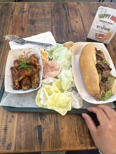 Customer service was wonderful the gentleman that took my order was great. Very personable and easy to approach despite being more of a kiosk based ordering system. I had the lemongrass pork Banh Mi and the Saigon Wings with a side of shrimp chips.