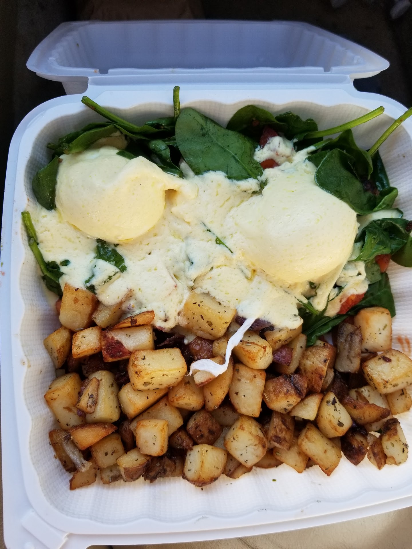 Read moreWow this place was such a let down compared to all the previous reviews. I ordered to go on a Saturday around 11:00am so this is strictly based on the "to-go" experience. Honestly, the service I received was horrid. I was told to go to the back of the restaurant in order to place my order. The blond haired woman behind the counter taking my order was beyond rude. She snatched my debit card out of my hand, then proceeded to throw it on the counter with a pen for me to sign. Anyway, I step outside to wait for my order and was told I would be notified when my order was ready. I waited and waited finally 40 min later I walk in and ask if it was ready. It had been hanging and ready for a while because it had grown Luke warm. The food: because it had sat for so long it was a gooey texture and not hot at all. The bread was soggy and not enjoyable. The actual flavor of the hollandaise sauce was lack luster, nothing memorable. I've had better Eggs Benedict. The house potatoes were under seasoned and cold...Good texture but bland. I will not be returning to this...