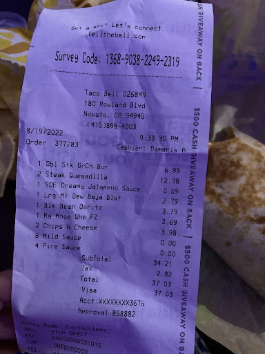 Read moreI don’t eat fast food when I treat myself , I usually noticed why I don’t eat it again. I’ve order Taco Bell twice the last week… and all my items were made so poorly. Didn’t seem like the food was handled with care or for them to even think about if they was going to eat it. The atmosphere and customer is good , the only other thing is they mess up a lot with the crunchy Gordita dorito taco every time I receive a regular crunchy Gordita taco. I just hope each worker is following food safety rules and cleanliness because both times Taco Bell made me feel sick to my stomach ….