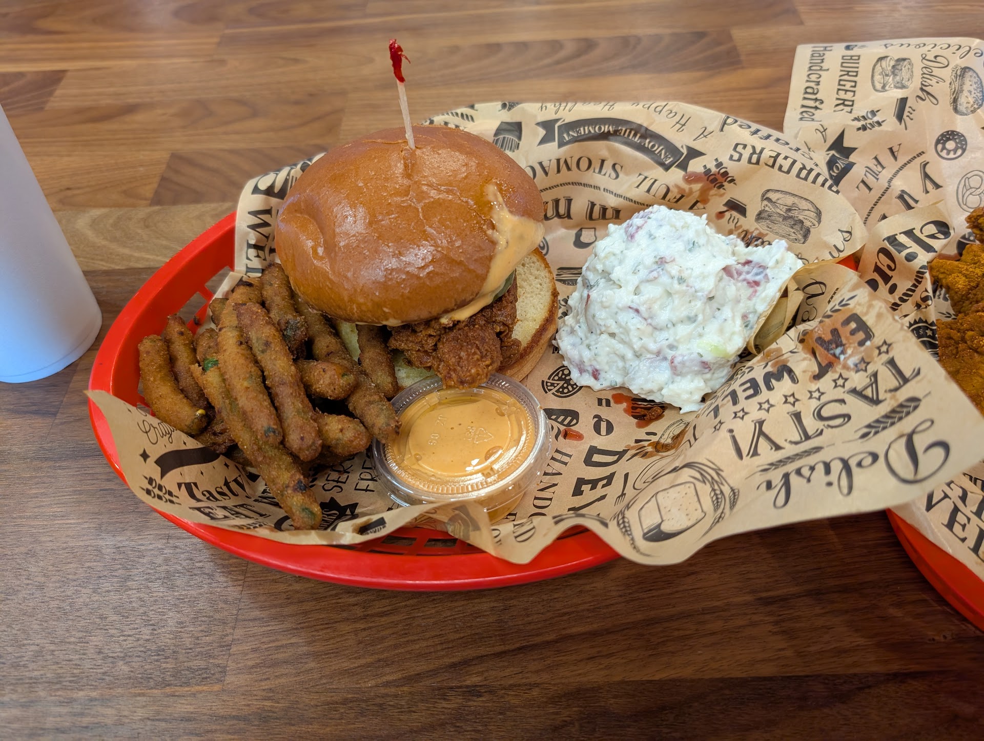 We ordered a couple Chicken Sandwhich combos (hot), with tenders (mild) and nuggets for one of the kids. Mac, fries, potato salad, and crispy green beans for sides. Everything was EXCELLENT. It was all cooked to order so it did take abput 10 minutes, which wasnt at all a problem. Arguably the best spicy chicken sandwich within a 20 mile radius and one of the best I've had in a long while. And that Byrd Bomb was sooooooooooo good too!