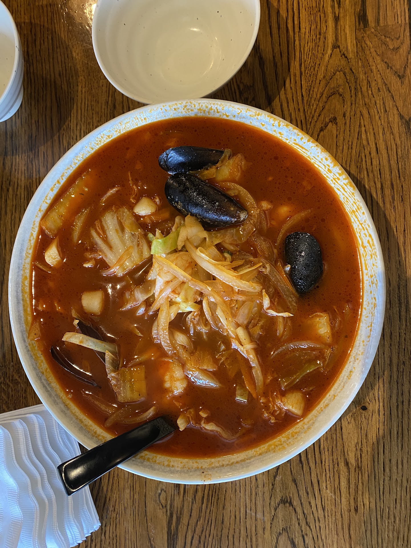 Read moreThis was our second time back, and not the last. Firstly, the atmosphere is really calming, and the music (which is just loud enough to hear and not overwhelming ) is soft instrumentals. All the staff, including kitchen, greet you, and you can choose where you’d like to sit. The lighting isn’t harsh white light, which I also very much appreciate. You’ll find a mixture of half booth half tables and regular 2-4 top tables as well. Both serves I’ve had are very kind and attentive, checking in when necessary. Today I had the champon, and a cup of hot green tea. The ramen come with a small bowl of salad with ginger dressing before your meal. The champon is so flavorful and warming. Loaded with veggies and seafood, definitely a reasonable price for what you get. I highly recommend getting this with udon noodles. And the green tea made me realize I probably have been using too hot of water when I brew my own. It was very mild without any bitter taste, and the cup is really cute. We were also given this really good rice dish on the side which holds you over before your main course arrives. The cost of 2 champon and green tea totaled $30, which is the same price I pay for 2 bowls of pho. And, they are located right next to a book shop, which is a nice place to pop into and maybe grab something to read before you grab food. We...