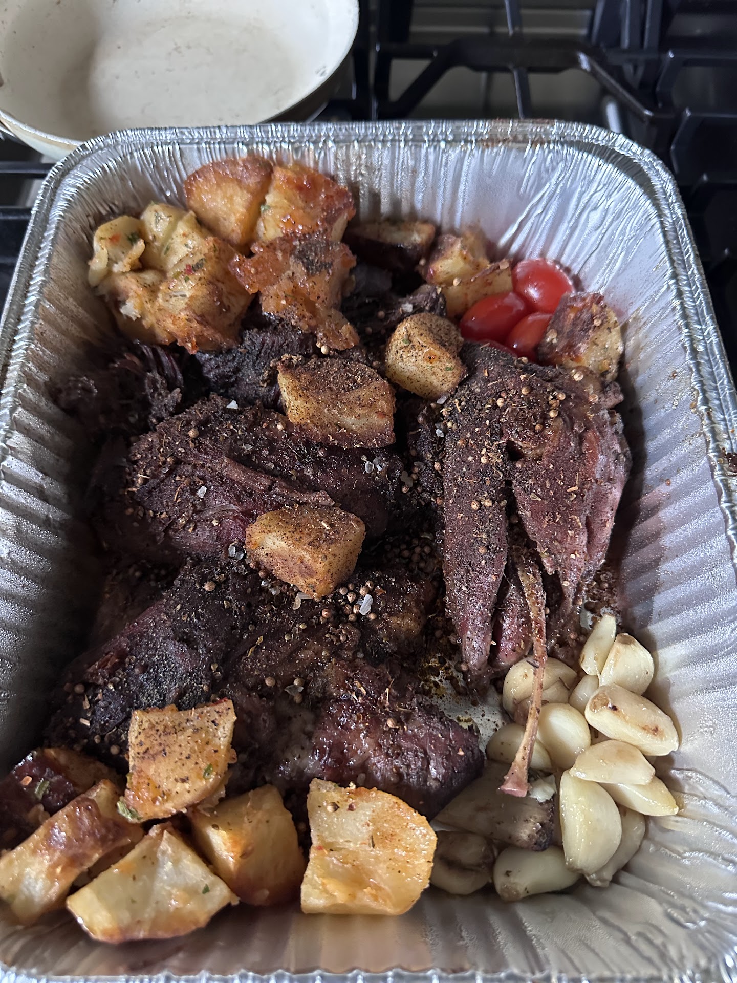 We purchased 2.5 Ilbs of meat: beef brisket, beef ribs, lamb neck. The sides they give you are roasted garlic, cherry tomatoes, roasted potatoes, a pickled pepper slaw of some sort, and sliced jalapenos and banana peppers. There were servings of rice, mashed potatoes and a variety of sauces waiting at our table. Soft drinks are included in the price of your meal.