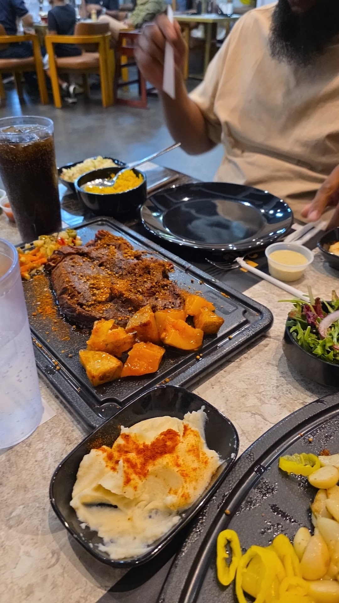 Upon arrival, the hostess greeted us and let us know that we order at the register and then the food will be brought out to our table. He pointed to a table across the room and told us we could sit there. Forewarning the restaurant is expensive. They charge 50 dollars for a pound of meat. Some items are only available by the pound. Others, like the lamb shank, you can purchase a half of pound. The meat is not smoked. Itās wrapped in foil and boiled in an oven. The main āchefā will ask you for your order. He may offer you a sample. I wasnāt initially impressed with the flavor of the beef however Iāve been wanting to try this place out for months so I decided to press on. I ordered a pound of beef ribs and a half pound of lamb shank. The guy puts on a fad like display when seasoning the meat. I think he is trying to channel salt-baes energy. He wildly sprinkles the salt/spice blend on the meat ( most of it lands on the plate) and then adds a dollop of honey. After wards there is the option to pile random sides onto the platter. Cooked garlic cloves, potatoes, uncooked cherry tomatoes, pickled bananas peppers, and hot peppers. The one pound of beef ribs and half pound of lamb shank came out to 78 dollars. My friend decided to just get a pound of beef ribs. Mind you, the meat is weighed, He took the bone out of my rib however he left the bone in hers. This can lead to inaccurate prices and measurements. once we got back to our table the sides were already served. The sides provided are single sized portions. We were told that the sides are unlimited. The sides included: cold corn salad, boxed mash potatoes, cucumber tomato salad, spring mixed salad with an acidic vinegar dressing, Mediterranean rice(dry and cold). In my opinion, the sides lacked flavor. All of them are served cold. We told them that we were not sharing sides and that we wanted to try all of the sides individually. we only received one portion of corn and mash. After trying it we didnāt ask for anything additional because it was not good. It all tasted like it is bulk buy premade food from costcos. They also dish out a ton of sauces. What we received was hot sauce, ranch, salsa, chimichurri, barbecue sauce, and a couple other sauces that my palette could not decipher. The sauces did not pair well with the meat and again they tasted store bought. I personally do not like the meat being seasoned after it is cooked. The seasoning barely made it on the meat. Also the meat was dry, had a jerky texture. All in all The food is expensive yet has a lack-luster taste. The sides are extremely disappointing and sub par. I will not be a...