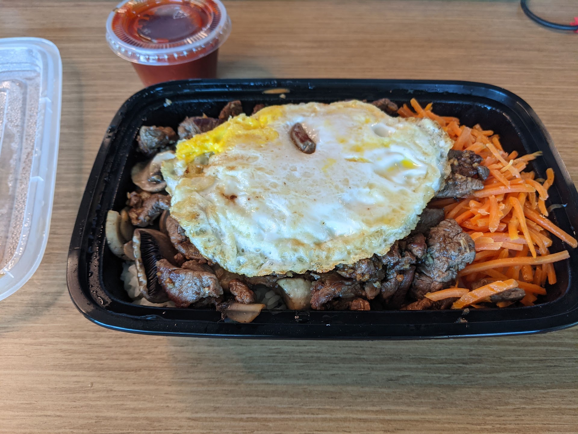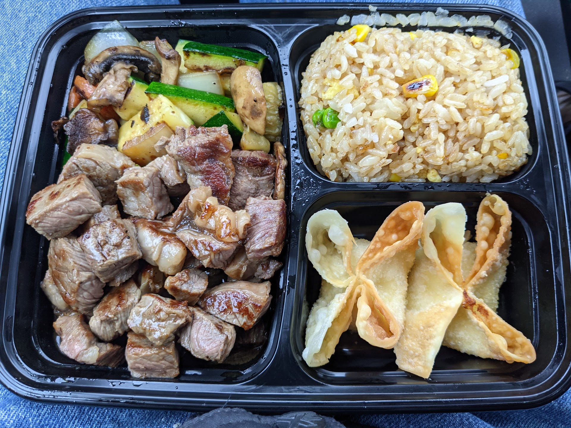 The Hibachi was delicious - the steak was cooked perfectly (medium) as was the shrimp. Not overly salty which is a mistake a lot of Asian restaurants make - if I want it salty, I'll make it that way. I ordered the fried rice (white or brown are no-cost options) and there was a generous portion of vegetables although it was mostly onions. Also included a dipping sauce that I didn't try - the steak, shrimp and veggies were seasoned just right and had just the right amount of oil/soy sauce.