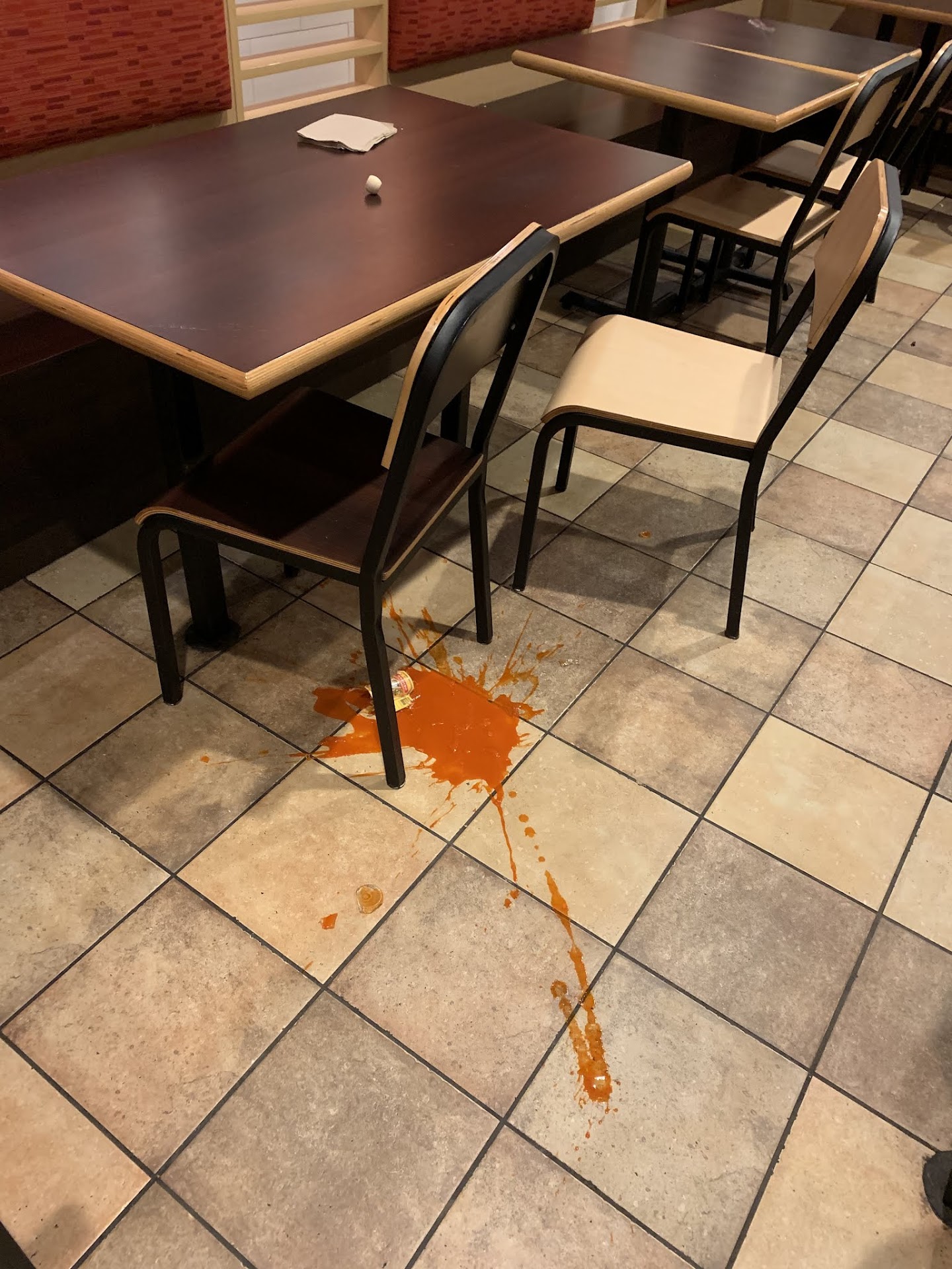 This may be the biggest disgrace to "Qdoba" that anyone will ever encounter. To start off, as soon as we walked through the door, we were not greeted. Instead, we were screamed at by an employee that "we're out of everything". Ignoring the rude gesture, we approached the employee, and she seemed extremely disgruntled. Regretfully, we decided to order anyways. After paying for our meals and turning around to find a table, we found that every single table was dirty. We kindly asked another employee to wipe down a table for us, and she stated, "There are a lot of other tables that are clean"...Needless to say there were none. We decided to just take our napkins and wipe one down ourselves. While taking our food to the table, we went to grab a bottle of hot sauce, only to find the top had not been screwed on properly. This resulted in the bottle dropping to the ground and the glass smashing into pieces. Right away, the employee yelled "What happened?" We told her the situation and she commented "Yeah, no one ever closes those bottles." Neither employee came to clean up the glass or hot sauce. Twenty minutes passed and the hot sauce and glass remained laying shattered all over the floor, while customers came and left. It's simply inappropriate and disappointing to know that two employees were feeding off each other's misery to create a toxic and dangerous environment for their customers to never want to...
