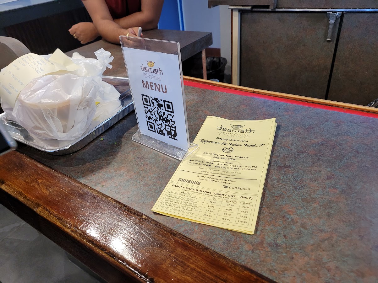 Attached phone shows the order I received, the QR code to the online menu and the yellow printed menu placed around...