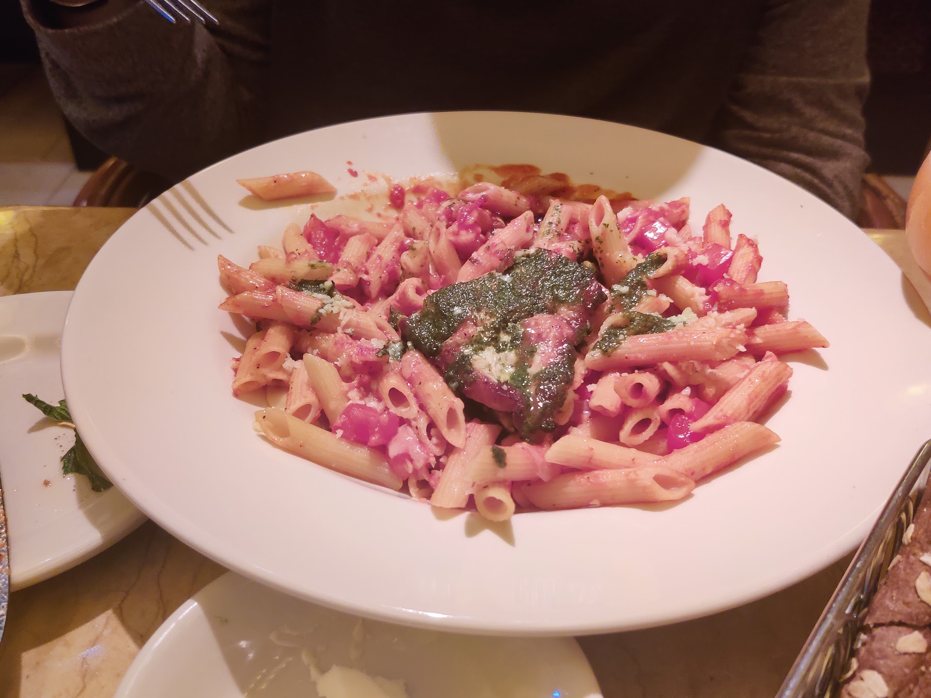 Roughly five minutes after our drinks came a server was finally assigned to our table. So here we are waiting for 45 minutes for service and they can't serve draft beer. We place an appetizer order for the Crab and Artichoke dip and we are informed that they do not have this item either (just our luck...). At this point we forego any appetizer and order our entrees. I ordered the Flat Bread Everything Pizza and my Wife ordered the Tomato Basil Pasta. The server told her mother to our left that cheesecake is taking 25 minutes to serve so if they wanted some to order it now. She never told us this but since we overheard the conversation we ordered a single slice of Cinnabon Cheesecake "to go" along with out entrees.