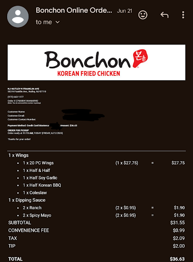 Been tolerating the Bonchon nutley with the service you guys are giving. But this time, it's enough. This is my last time ordering here again. There are better places that I just found out and gives also quality and better services, and food...