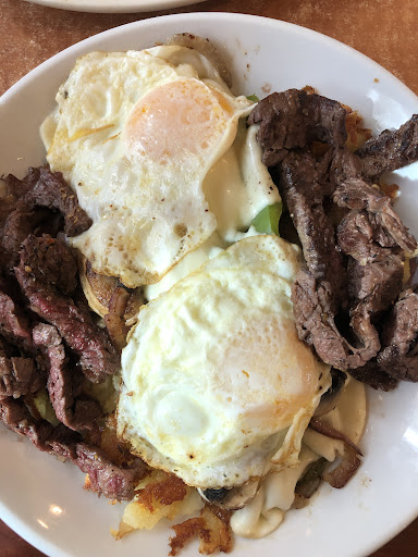 Cons: Firstly, the manager (? not sure if they were or not, didn't present themselves AT ALL) was a rude pos who came to my table DEMANDING why i turned back 2 of the meals and had them replace the Breakfast sandwich as the eggs were overcooked (possible prepreped and heated), and the bacon was bland and tasted cheap and strange and had the waitress order a gyro in replacement. I also told the "manager" to take back the steak wrap as it was the most blandest steak I've ever tasted even though the steak was cooked medium rare, it had no sear and was cooked to the bare minimum with no seasonings. Also the feta cheese was bland and wasn't fresh as it was soggy and not very salty, sign of outdated or not well packed/stored cheese. The Manager didn't take to my critiques too well as the walked away and didn't bother to apologize for anything and told the waitress to take the wrap and bfast sandwich off my bill. That's a person who needs to develop a spine and take critiques when they came to the table and demanded I explain why myself. They need to learn how to help their staff grow and do right by the customer and take responsibility like a man should. I honestly lost my appetite from the whole ordeal.