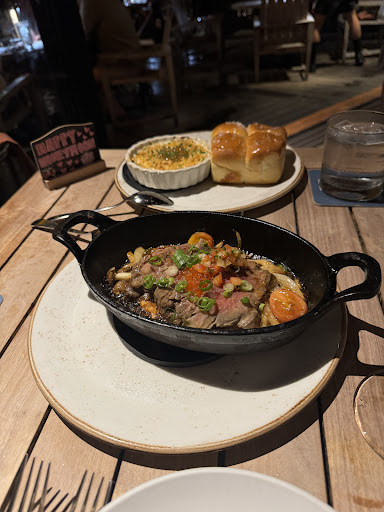 To start, we ordered the goat cheese dip which was delicious, served with small Hawaiian buns. We also got the sizzling beef tobanyaki - also very good.