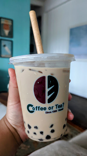 Outstanding experience here! After grabbing dinner at the Thursday farm market across the street, we stopped in at Coffee or Tea for a dessert. My son, a mango smoothie connoisseur, had seen the bubble tea sign during our trips in and around Kailua and wanted to give it a try. We are glad we did! First, the menu lists the kinds of milk tea available: Assam, oolong, jasmine, etc - always a sign of a real tea in your drink. We ordered a grande Assam milk tea, grande mango smoothie, and a shaved ice dessert (Asian style shaved ice, not the Hawaiian style at most places in Hawaii). Grande is their smallest size, but we found it very generous for the price. The mango smoothie had a nice consistency and the boba pearls were perfectly cooked - soft and still a little warm when my son received the drink. The Assam milk tea was also excellent. Same perfect boba, and a milk tea that was slightly sweet and smooth. The highlight was the shaved ice. For a very reasonable 6 dollars, we received a shave ice with our choice of 5 toppings. We chose three traditional asian toppings: azuki (red) bean, herb (grass) jelly, and condensed milk; a new topping: coffee jelly; and ice cream because...ice cream! The shave ice was large enough for all 3 of us to share. The coffee jelly was great! A coffee taste, but not too sweet! Azuki (red) bean was a nice soft, but not mushy texture. Grass jelly was a subtle taste and not too gelatinous. The ice cream was also very good quality: creamy and not full of air! To top of our experience, the owner/server was fantastic! It may have helped that it was a down time, but everything was made with care and presented artfully. Also, he could tell that we were enjoying the shaved ice and offered two of his other toppings for us to sample: custard and tea jelly! They were both also excellent. We found out that he makes the coffee jelly, tea jelly, and custard himself. Handmade toppings explains why the taste and quality were so high! We can't wait to go back, and only wish we had found Coffee or Tea? earlier...