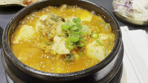 I got a #2 tofu soup and I chose seafood topping. I was gonna order beef but I wanted to know what kind of seafood was inside. So the seafood was just a lot of clams and some squid. I just love how it comes out of kitchen, Sizzling and stayed hot until I finished all. It looks really spicy but it’s not! It’s mild and very flavorful soup. If you like...