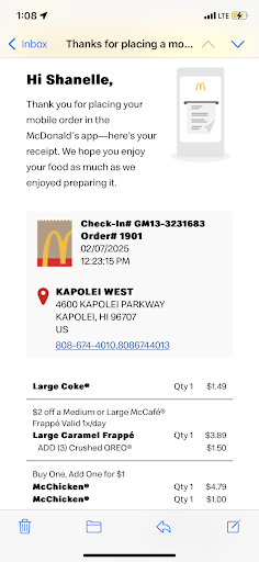 Read moreMcDonald's in Naniakuli the order taker in the drive thru was pleasant accurate & delightful. The women at the pick up window on the other hand was unpleasant. Rude & should not have been working with the public. She informed me that each cat was only allowed 1 complimentry cup of ice/water. Since this was very different than what I experienced almost daily forever I asked for a large cup of ice & would & would pay for it Then I asked for the Splenda & Lemon I had ordered. She handed me 1 of each. I said had ordered 4 of each. She then proceeded to lecture the women at the Pay window. Customers r only entitled to 1each! I said I still wanted them she said $,79 I asked each or for all 3? She yelled for the manager. All this while holding up the Drive Thru. About 4 minutes later s women appeared & said it would be $1.89 additional. So finally I wad so disgusted I said no thank you & left & have not been back to the Nanakuli McDonalds since! The issue is not the money it's the attitude of...