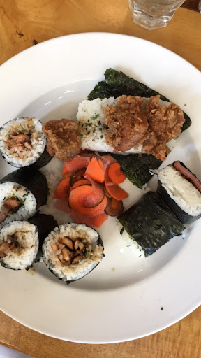 I ordered a salad that came with a calamansi vinaigrette, and it was delicious! I love calamansi, so it has a nice tart but honey-esque flavor. For my entree, I ordered the 3-kine musubi and yum! You get spam musubi, garlic chicken musubi, and teriyaki salmon. They were all delicious, especially the garlic chicken as it's fries and crispy.