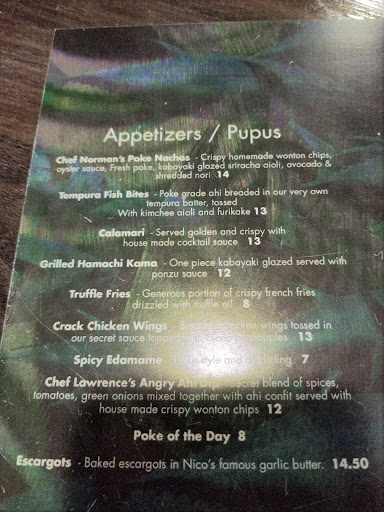 Read moreAtmosphere is what you would expect from a restaurant with live music. We were there before the music started so we can’t say anything about what to expect. We ordered uncle Nic’s poke nachos as an appetizer and they were delicious. A huge mound of tuna on a bed of fried wonton surrounded by 4 heaping servings of guacamole. For our main course we had the crab cake on butter lettuce and the jumbo shrimp scampi linguini. Both tasted good but the serving size of shrimp was much smaller than expected. For $29, it had only four large shrimp on a small bed of pasta, comparing this to the a plate load (10+ pieces) of shrimp for $17.50 from Giovanni’s food truck along the north shore the day before. The crab cakes came on a bed of iceberg lettuce and chopped beets. We also ordered the Thai chicken soup which was also delicious but we didn’t get to finish it because the poke nachos plate was so large. We actually ended up taking most of the food home because we were so full from the appetizer. We got a side of French fries, too, and it was larger than the shrimp entree. One other point, is the service was a little too fast. The soup came out at the same time as the entrees. Perhaps they were rushing to finish the dinner crowd before the live music started. The waiter was friendly and checked on our table the right amount of times. Would give 5 stars for his service alone and 3 for the...
