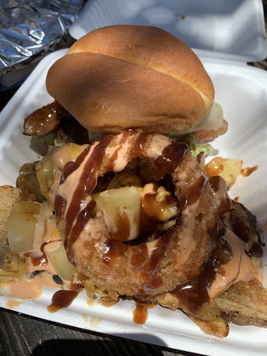 There is a huge nearby parking lot. There's also outdoor seating but probably only one table that had shade, so it got HOT out there. I'd recommend grabbing the burger to go and eating in the comfort of your air-conditioned car. Just make sure you grab...
