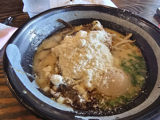 We both had the Original Tonkatsu Ramen which is the white broth that originated in Fukuoka. It was fantastic! The broth is delicious and not at all "salty". The noodles they use were to our liking, firm with a chew and curvy ribbons that hold the soup. Also, the tonkatsu itself was very delicious. It comes with toasted garlic and reconstituted mushroom ribbons that were quite good. I don't normally drink the broth, but I couldn't help but drink the whole bowl of leftover broth!