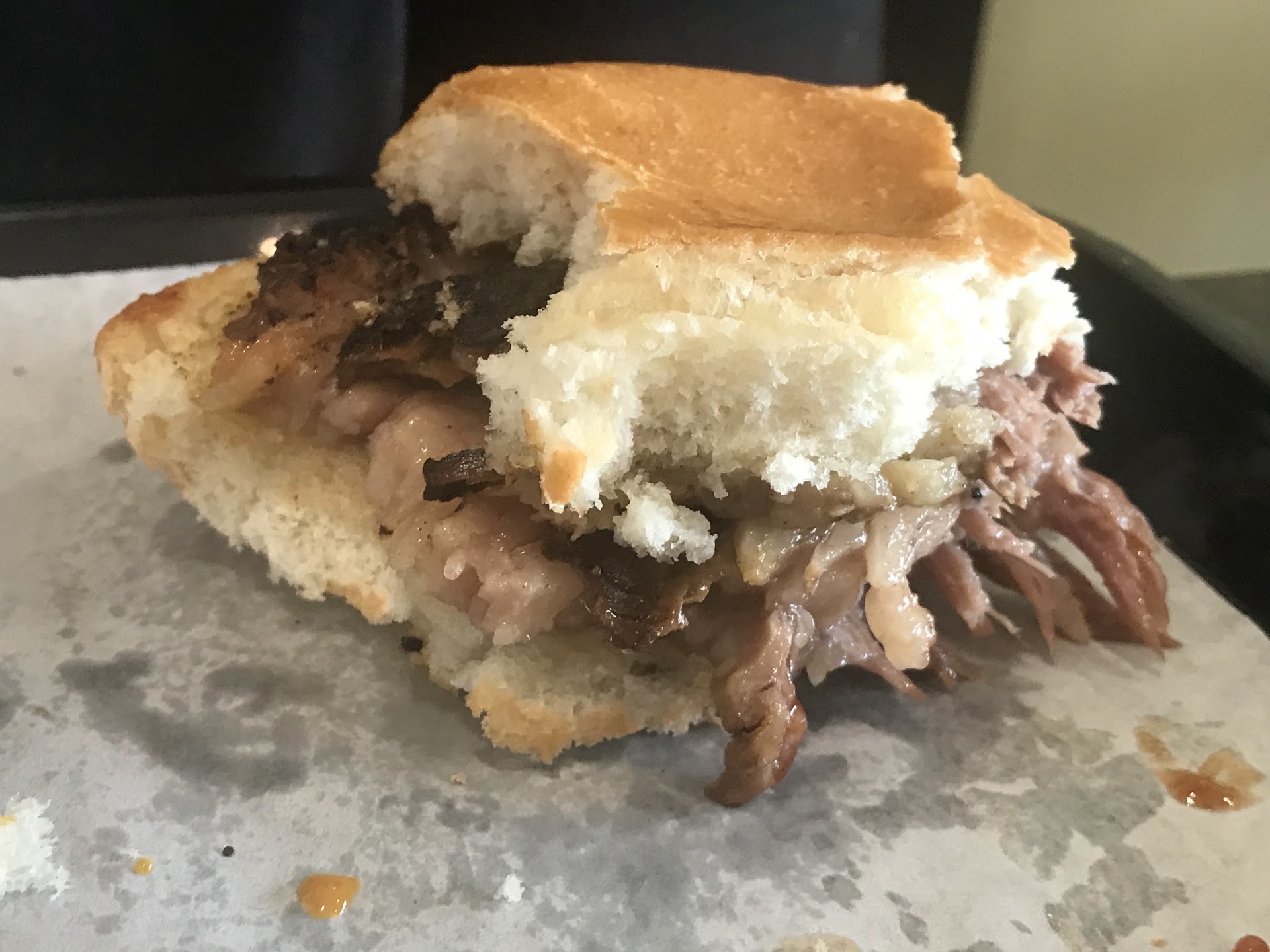 We ordered the brisket sandwich, the half rack of ribs, mac and cheese and baked beans. My boyfriend noticed the bun was huge compared to the portion of brisket, but reluctantly agreed after finishing his meal that it was better this way because it kept the sandwich together and kept the bun from being soggy. My ribs were fantastic. You couldn't even eat them like regular ribs because the meat would just fall off when you picked up a bone, so I was forced to use a fork, which I was more than happy to comply with.