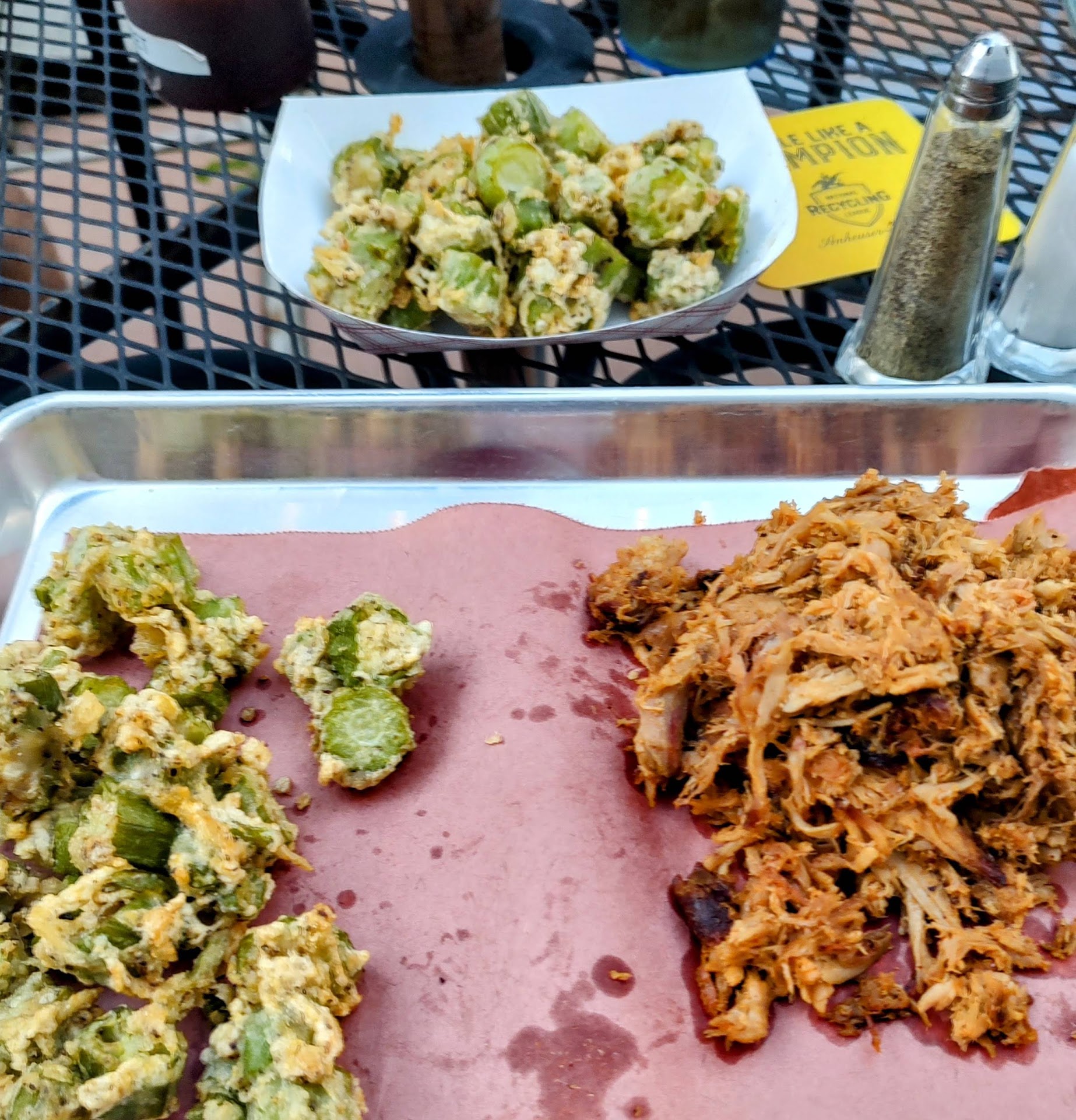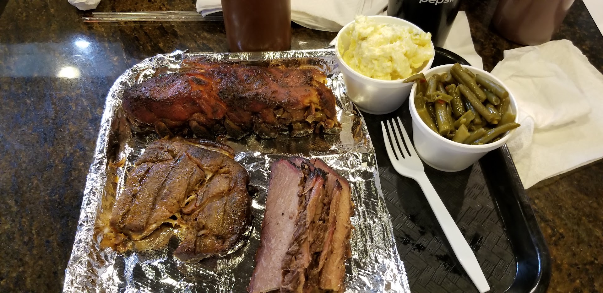 We ordered a pork steak dinner, 6 smoked chicken wings w/side, and a pulled pork dinner. The pork steak dinner really changed since I had it last from the original proprietor. It was much smaller and was not sauced. They use a rub on it before BBQing. It wasn’t bad, but not at all like I remembered which was twice the thickness, really juicy and tender. The small size for the $18 price tag was not a value to me at all. The chicken wings however were actually pretty good. They are large whole wings, smoked with a crispy skin. We both enjoyed them. The pulled pork sandwich was just so-so. The sides we ordered were the onion rings, which were crispy and delicious, but they offer just 4 of them as a side, the Mac and cheese which was okay, the baked beans which also was just okay, and the spicy green beans which were way too spicy for my tolerances and couldn’t even eat them. I should have chosen the potato salad.
