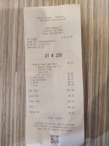 Traveling and got into town late. Thought why not give it a try? I'll begin by saying the Roast Beef was excellent, it went downhill from there. Went through drive thru, and only got half my order. Salad and drink. Tried to call the restaurant at 636-329-4071, automated message and then phone hung up. So I went back about 10 minutes later to get the Roast Beef and fries. Guy at the drive up window says you drove off without your order? Yeah thanks maybe put the whole order in one bag? I ate one fry and said to myself this is terrible. Cold fries that had been sitting for a long while. Went back the following day around 6pm with the fries. After standing there for a couple of minutes listening as one employee was talking to the other about the need to "get the fries up". When I got served said to the person at the counter just what he said I need the fries up and that I was returning my order. Person at the counter looked blankly at me and said ok. Left the fries in a bag and the receipt on the counter. Thought maybe person would say sorry about that and offer something else. Really should be one star but did like the roast beef and the...