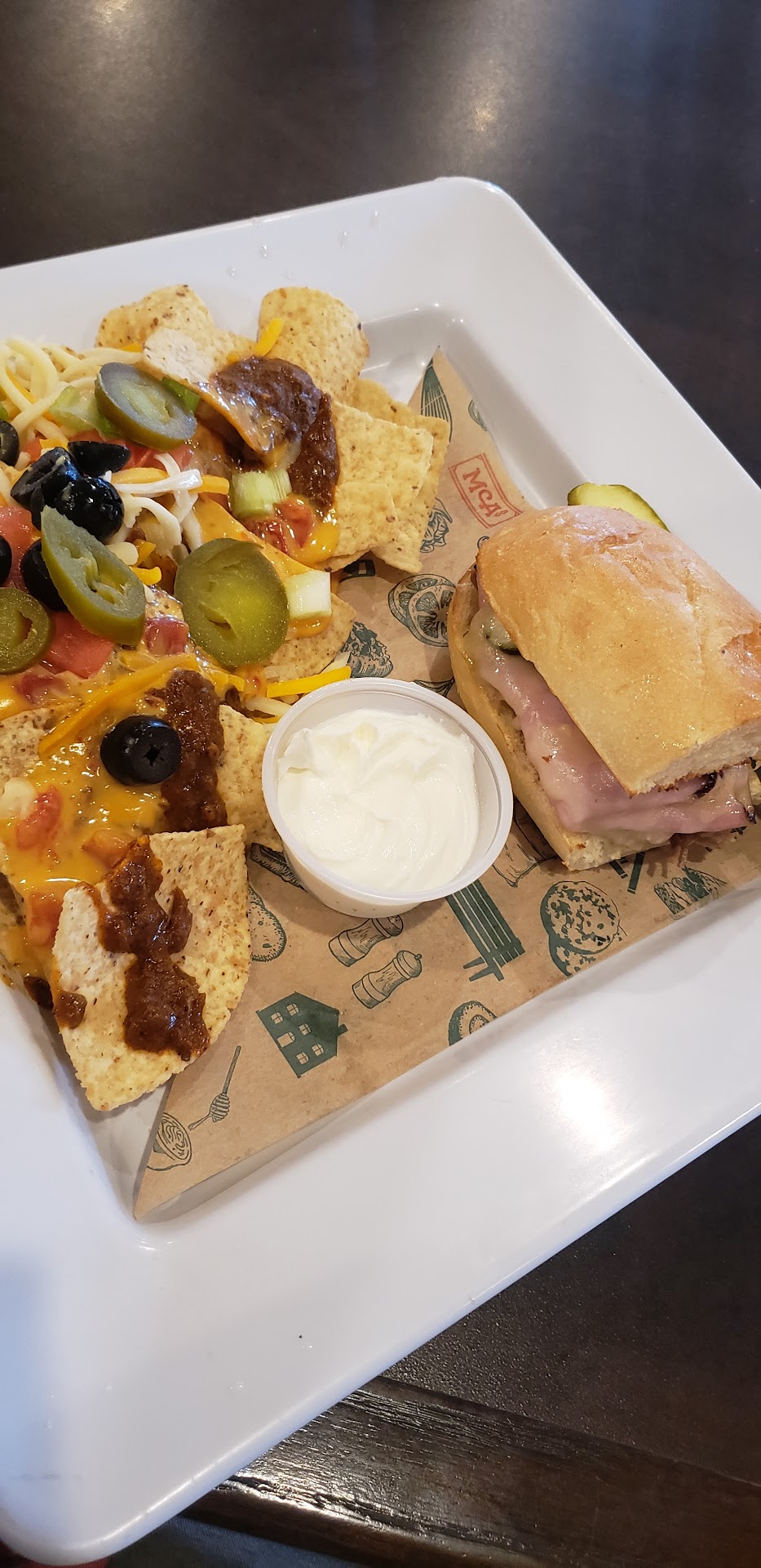 I had a pick 2. "Half" Cuban sandwich, and half order of nachos. The half sandwich was a complete joke. It looked like a toddler sized sandwich. It was literally 3-4 inches long. I put it in the palm of my hand (I have small hands) and it was the size of a large slider. Taste-wise, it was ok. But it's advertised as being served on a baguette, and it DEFINITELY was not. It was served on what seemed like a very soft hoagie roll. It was extremely disappointing.